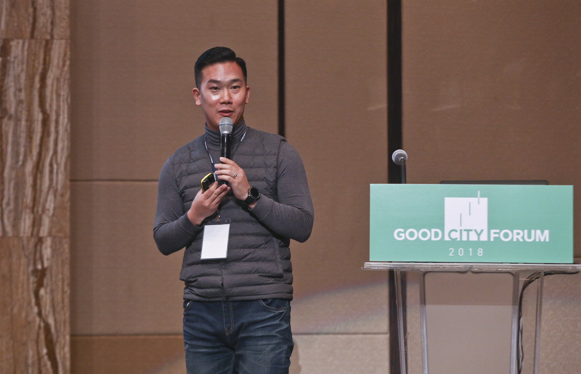 [서울=eoimage] 시사저널 고성준 기자 = 23일 오후 서울 중구 밀레니엄 서울힐튼에서 열린 '굿시티포럼2018'에 참석한 천안청년들 최광운 대표가 발언하고 있다. 2018.10.23