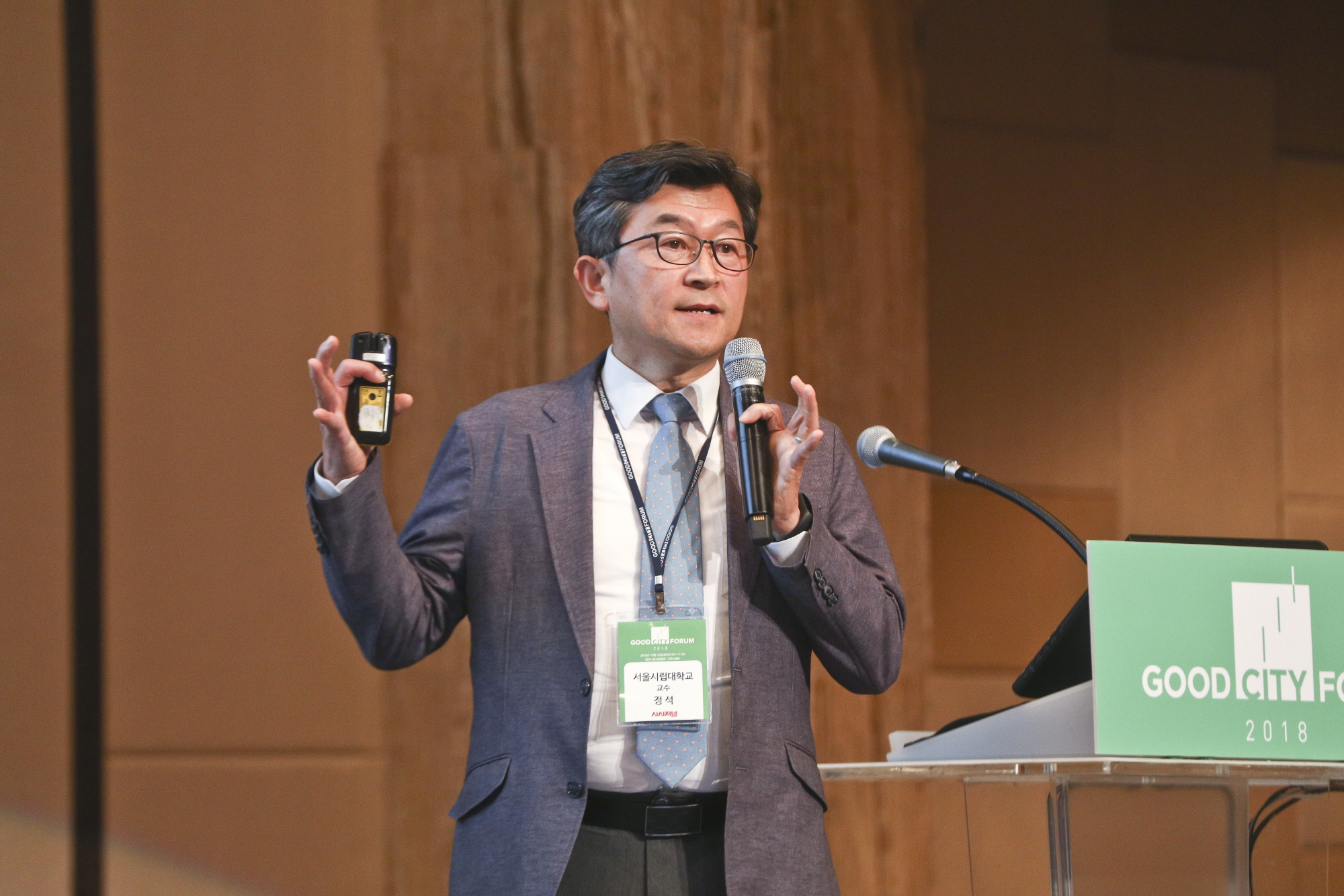 [서울=eoimage] 시사저널 고성준 기자 = 23일 오후 서울 중구 밀레니엄 서울힐튼에서 열린 '굿시티포럼2018'에 참석한 정석 서울시립대 교수가 '내몸재생에서 국토재생까지'를 주제로 발표하고 있다. 2018.10.23