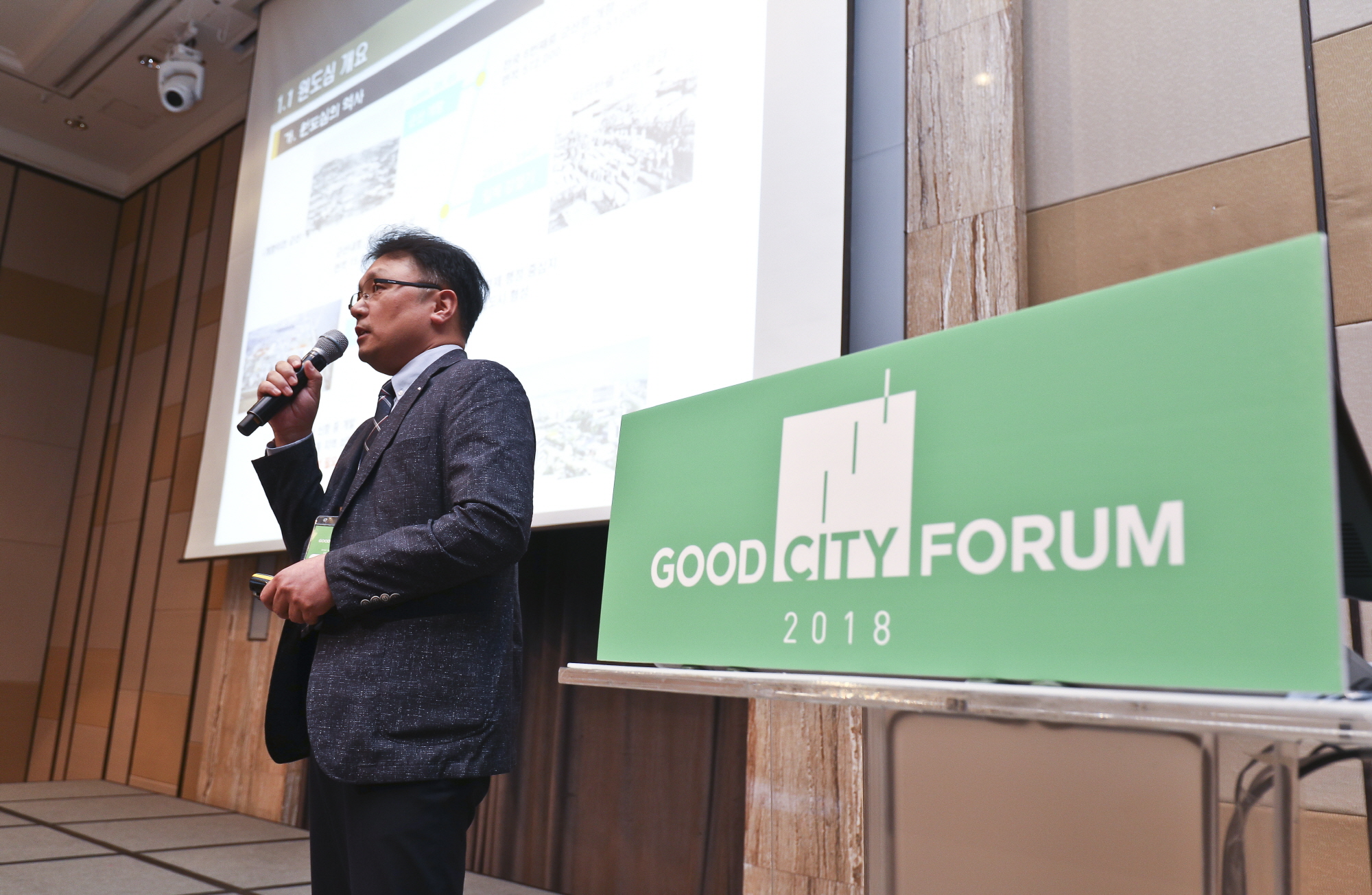 [서울=eoimage] 시사저널 고성준 기자 = 23일 오후 서울 중구 밀레니엄 서울힐튼에서 열린 '굿시티포럼2018'에 참석한 송석기 군산 도시재생지원센터장이 우수사례를 발표하고 있다. 2018.10.23