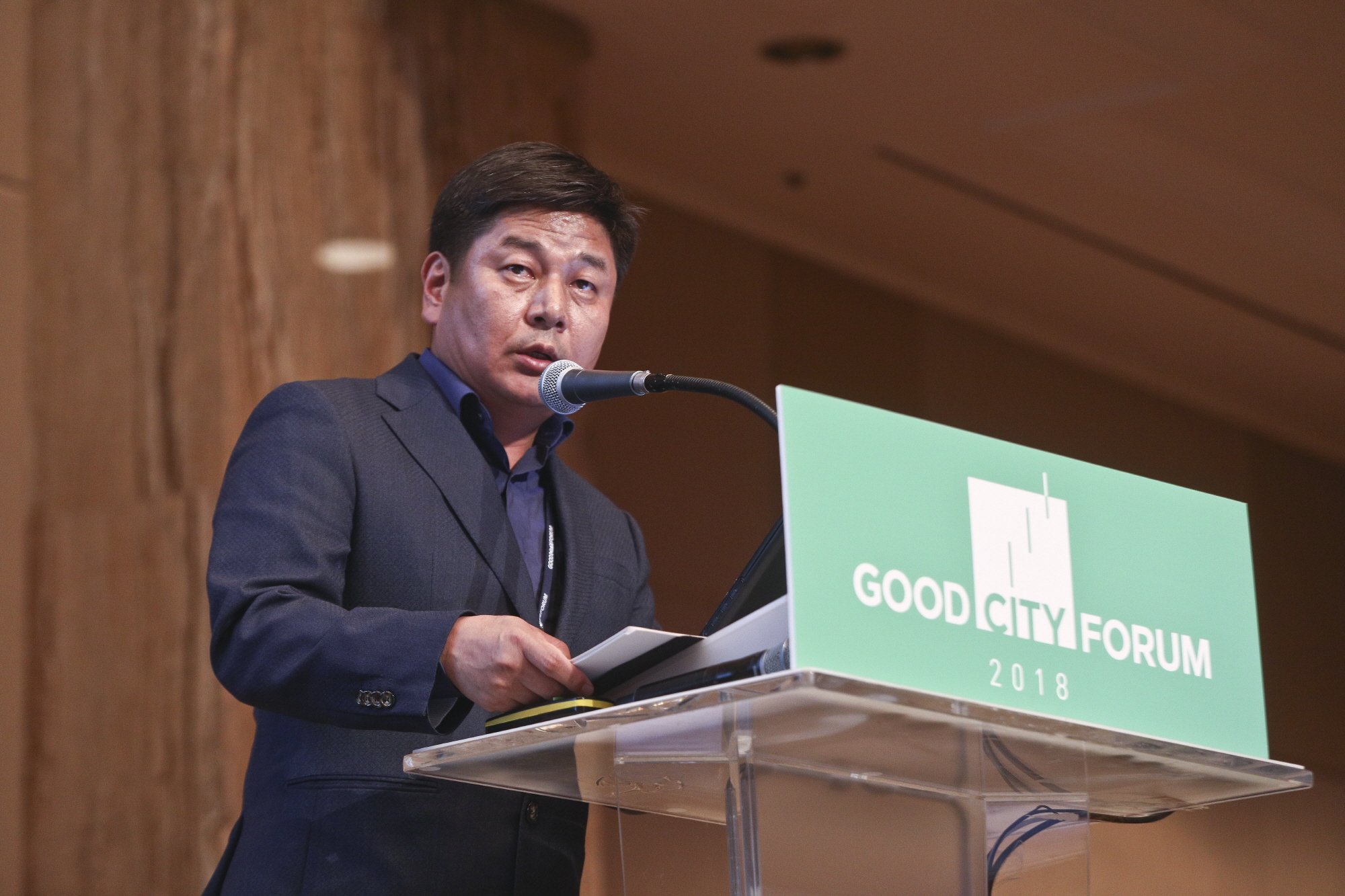[서울=eoimage] 시사저널 고성준 기자 = 23일 오후 서울 중구 밀레니엄 서울힐튼에서 열린 '굿시티포럼2018'에 참석한 정승교 부산시 사하구청 도시재생과장이 우수사례 발표를 하고 있다. 2018.10.23