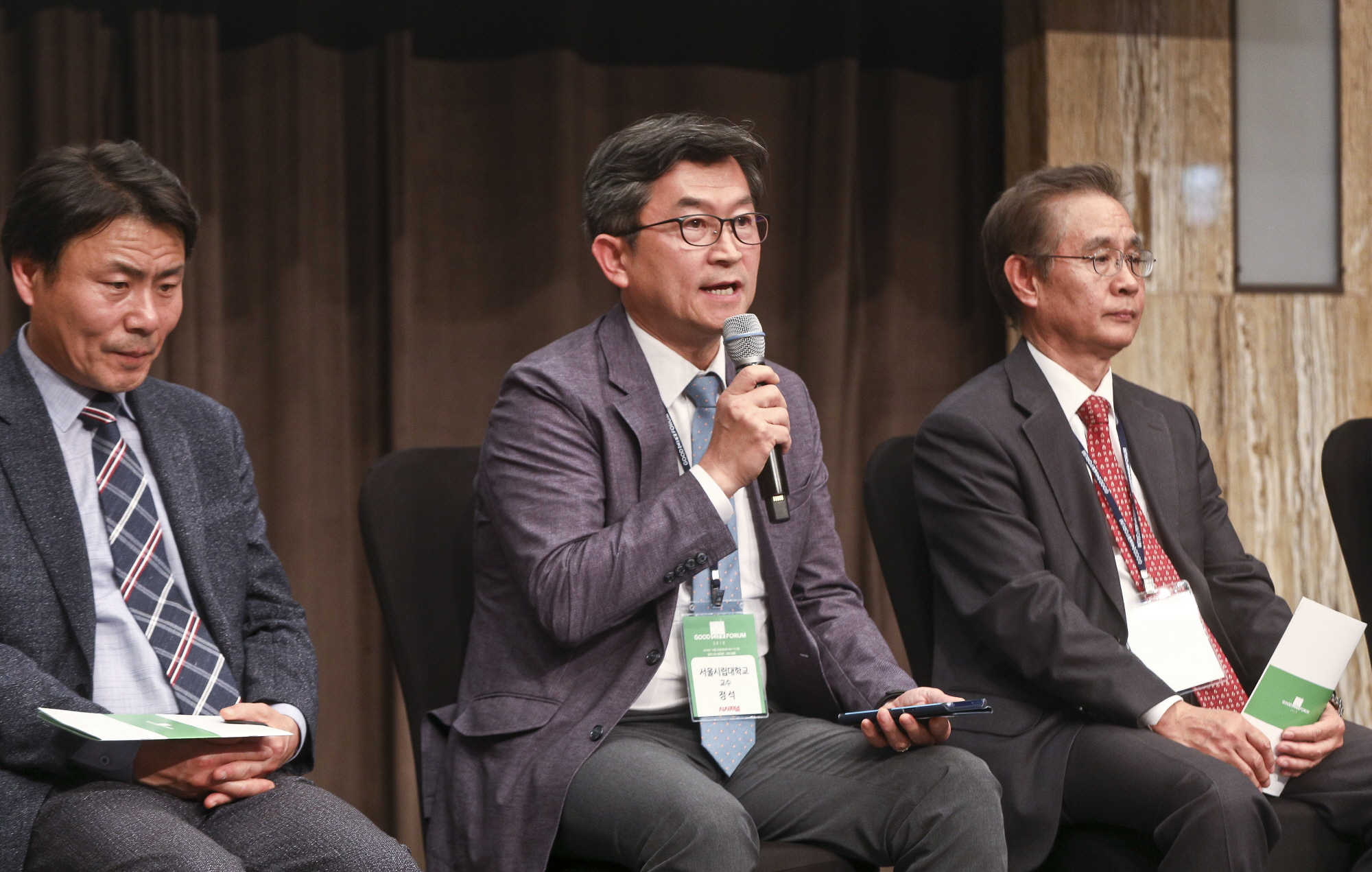 [서울=eoimage] 시사저널 고성준 기자 = 23일 오후 서울 중구 밀레니엄 서울힐튼에서 열린 '굿시티포럼2018'에서 정석 서울시립대 교수가 도시재생뉴딜 사업의 성공적 안착을 위한 종합토론에 참여하고 있다. 2018.10.23