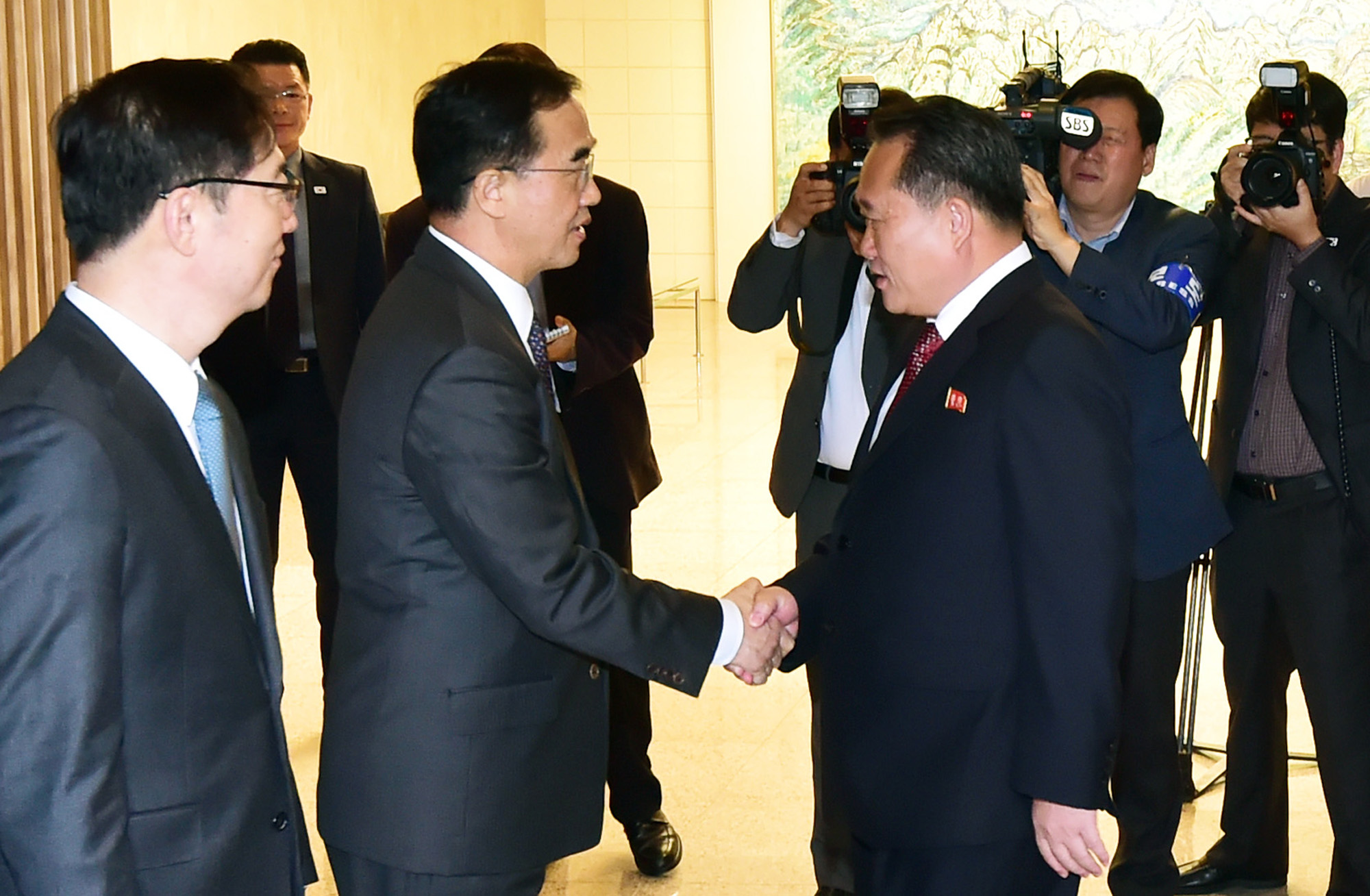 평양공동선언 이행방안 협의를 위한 5차 남북 고위급 종결회담이 15일 오후 판문점 평화의집에서 개최된 가운데 조명균 통일부 장관을 수석으로 한 우리측 대표단과 북측 리선권 조국평화통일위원회 위원장의 수석대표단이 공동 보도문을 발표한 뒤 평화의 집을 나서기 전 마지막 인사를 나누고 있다.(사진공동취재단)