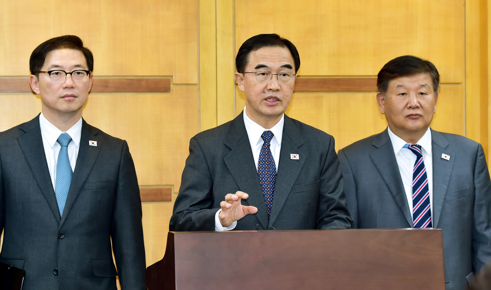 평양공동선언 이행방안 협의를 위한 5차 남북 고위급 종결회담이 15일 오후 판문점 평화의집에서 마친 가운데 조명균 통일부 장관을 수석으로 한 우리측 대표단이 브리핑을 갖고 있다.