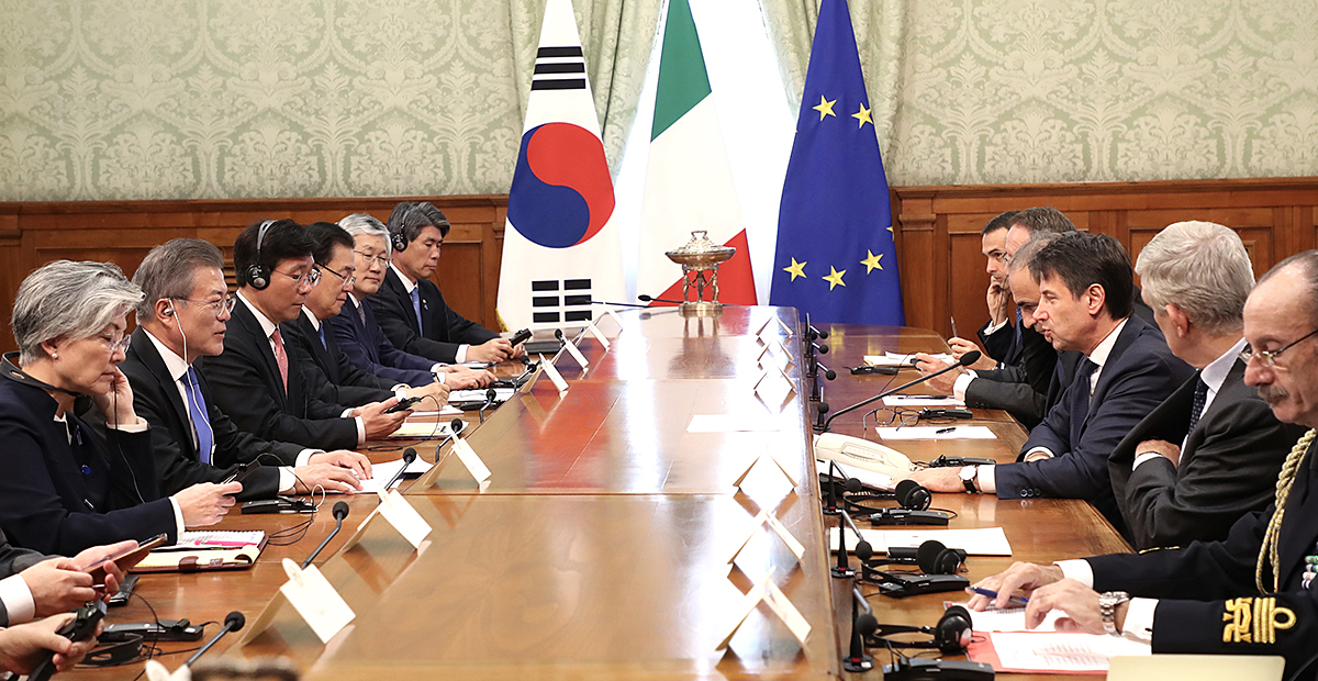 문 대통령은 17일(현지시각) 오후 2시30분께 이탈리아 로마의 총리 궁에서 콘테 총리와 한·이탈리아 정상회담을 하고 있다.