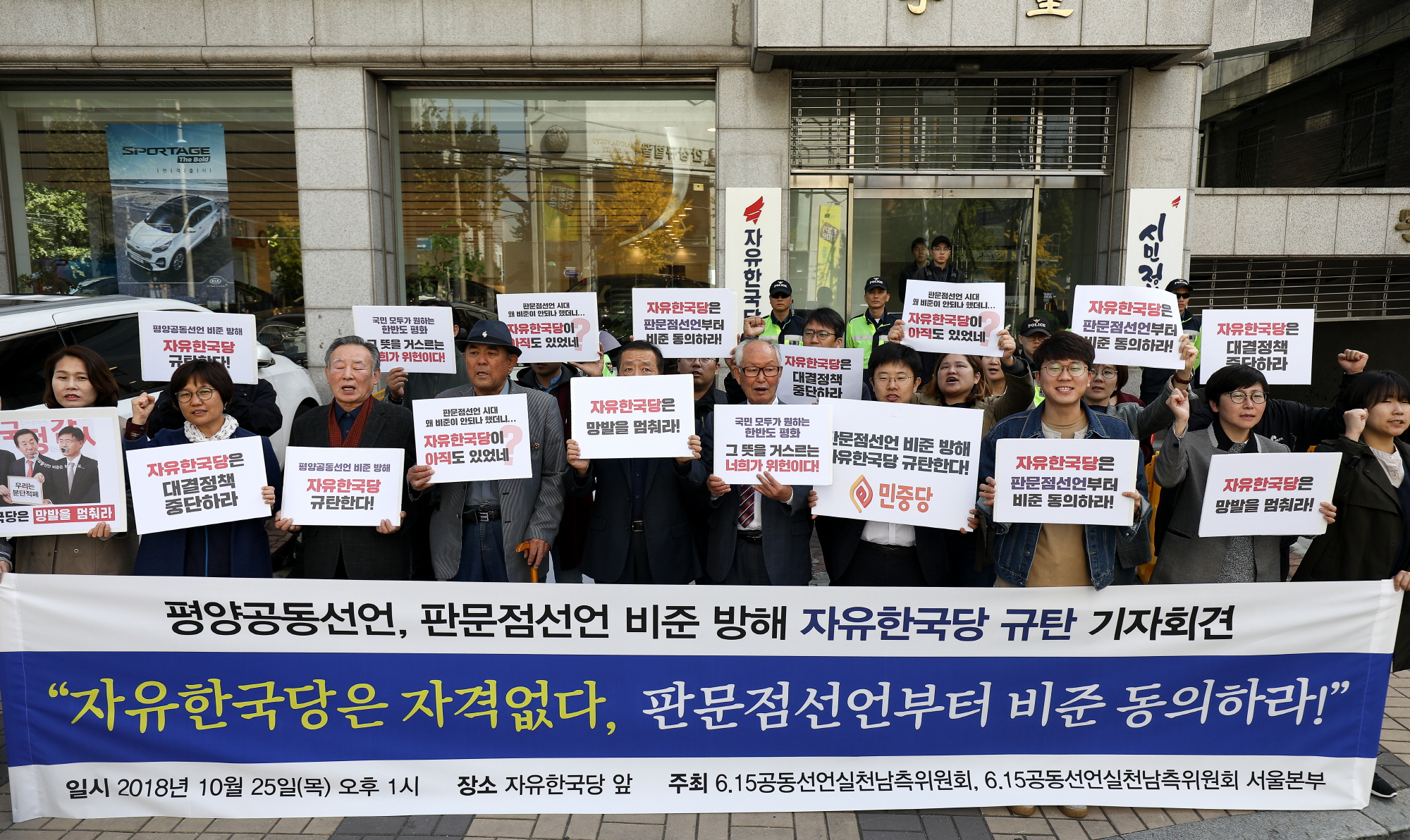 [서울=eoimage] 고성준 기자 = 25일 오후 서울 영등포구 자유한국당사 앞에서 열린 '평양공동선언, 판문점선언 비준 방해' 자유한국당 규탄 기자회견에 참석한 6.15공동선언실천 남측위원회 회원들이 피켓을 들고 있다. 2018.10.25