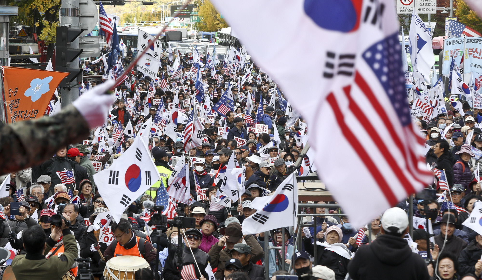 [서울=eoimage] 일요신문 고성준 기자 = 27일 오후 서울 중구 대한문 앞에서 한국교회연합, 애국시민단체연합 을 포함한 보수단체 회원들이 '문재인 정권 퇴진 국민 총궐기' 집회에 참여하고 있다. 2018.10.27