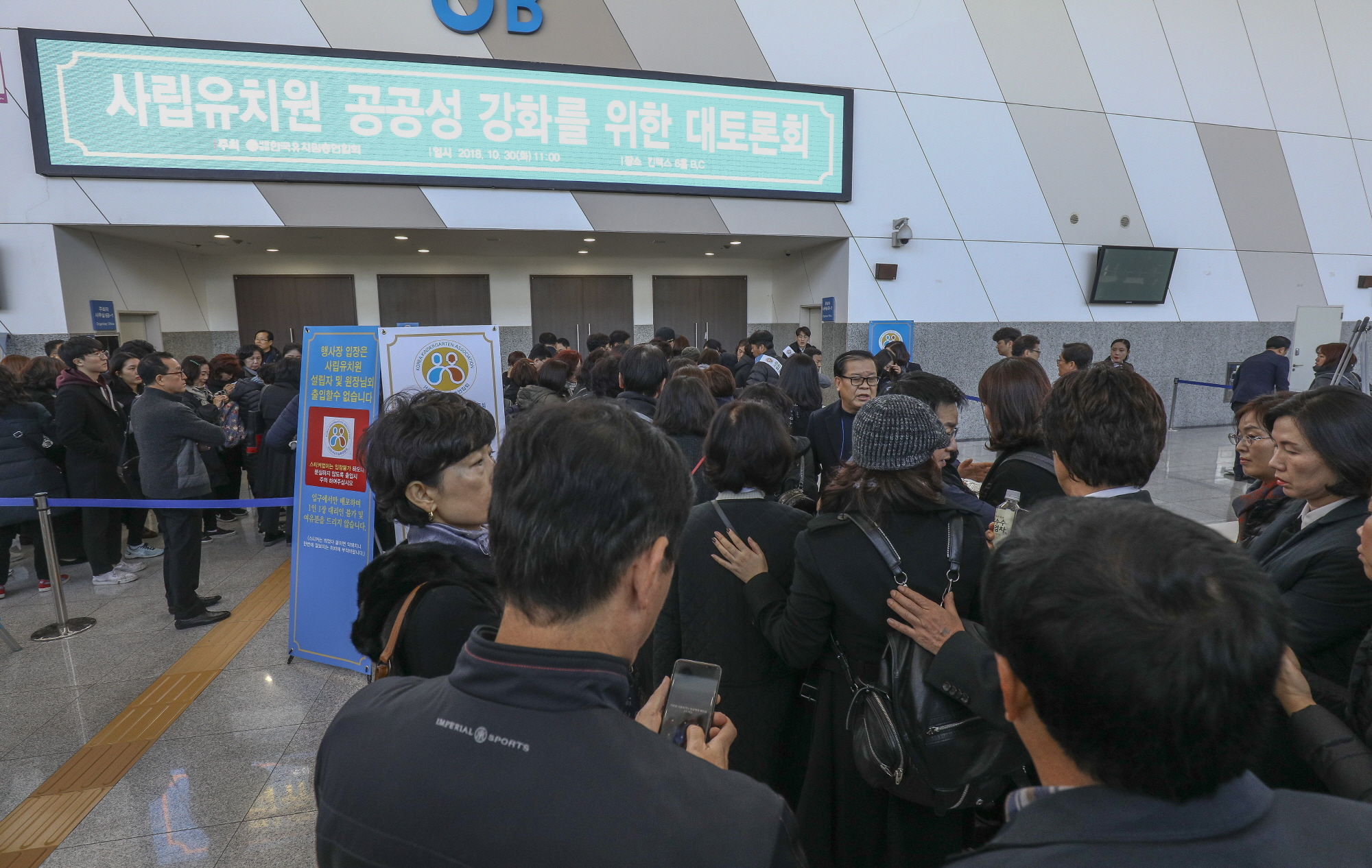 [고양=eoimage] 고성준 기자 = 30일 오후 경기 고양시 일산 서구 킨텍스 제2전시장에서 열린 사립유치원 공공성 강화를 위한 비공개 대토론회에서 한국유치원총연합회 소속 사립유치원 원장 및 회원들이 정부 대책에 대한 항의 표시로 검은색 복장을 착용하고 입장하고 있다. 2018.10.30