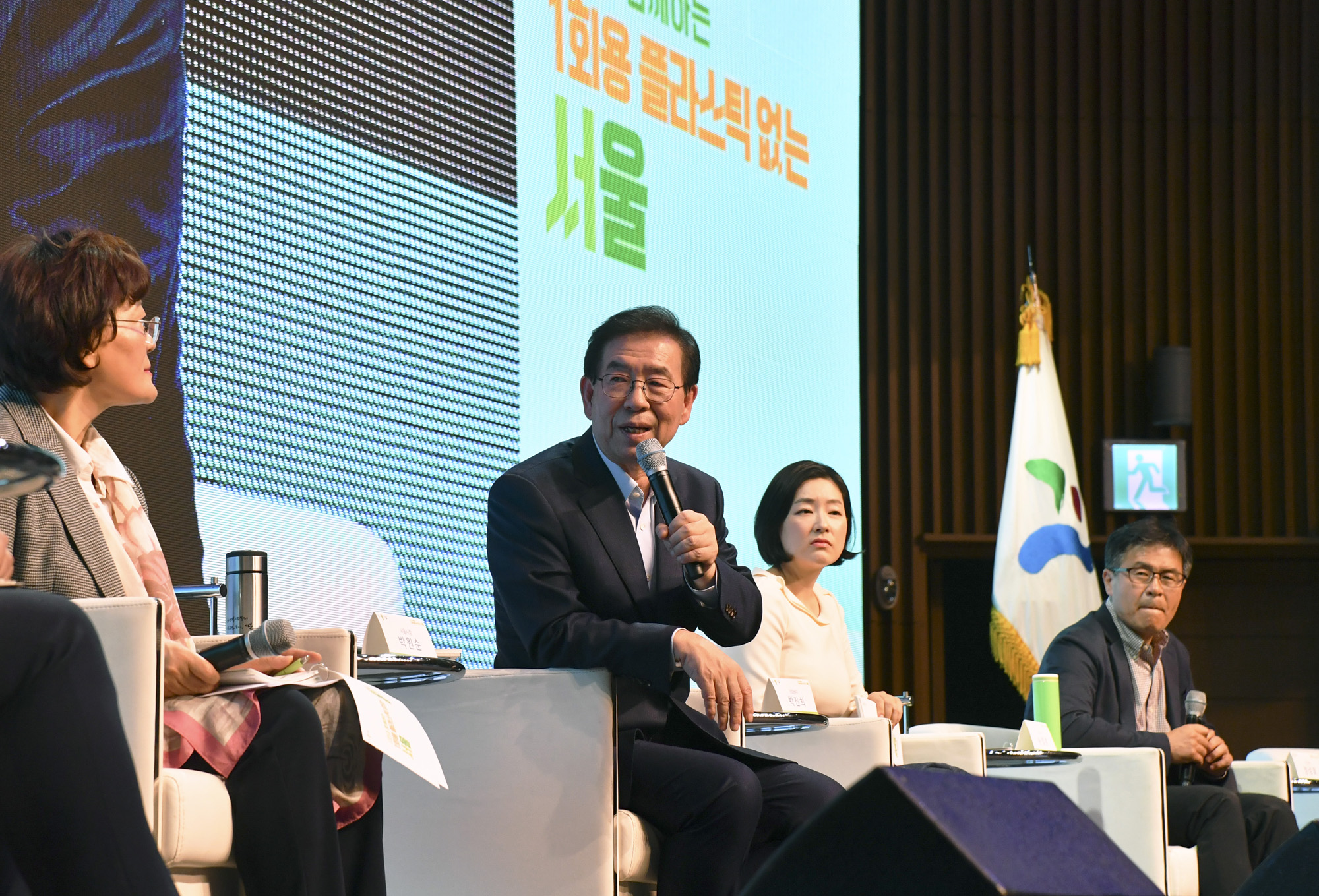 박원순 서울시장이 15일 오후 서울시청에서 열린 '1회용 플라스틱 프리 서울 토크콘서트'에 참석해 시민들의 질문에 답하고 있다. 서울시 제공