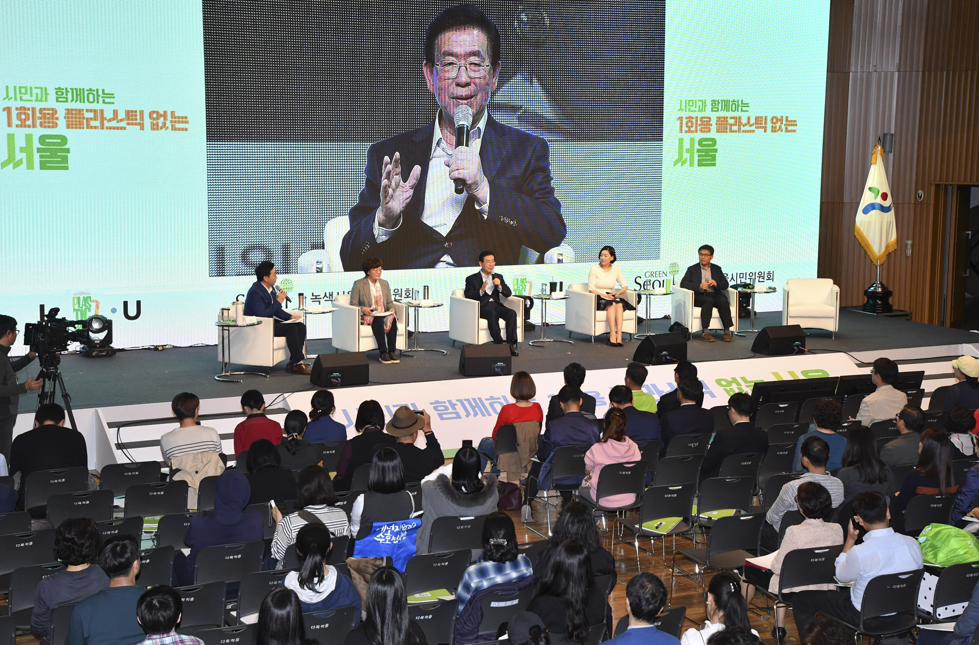 박원순 서울시장이 15일 오후 서울시청에서 열린 '1회용 플라스틱 프리 서울 토크콘서트'에 참석해 시민들의 질문에 답하고 있다. 서울시 제공