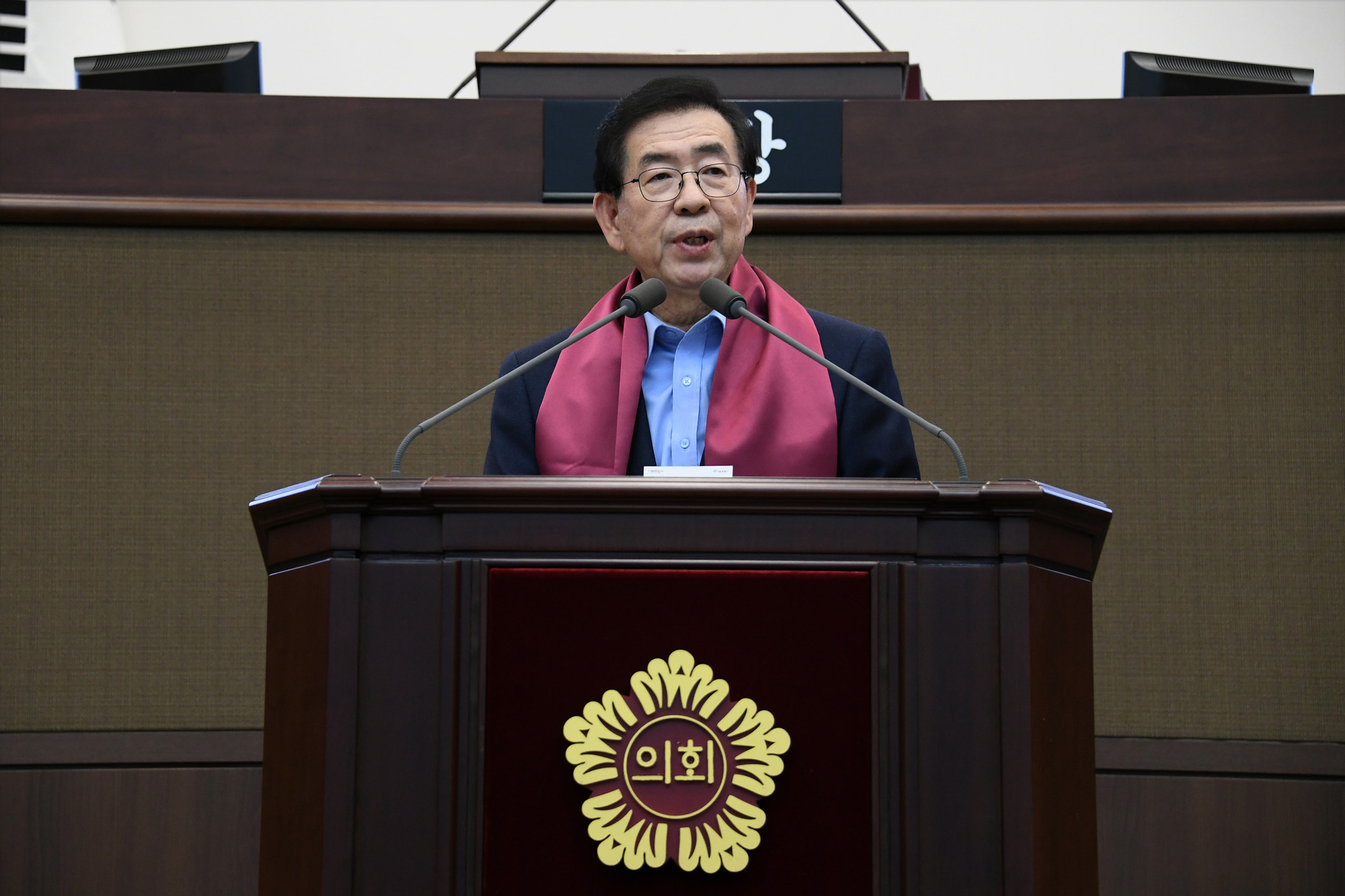 박원순 서울시장이 20일 서울 중구 서울시의회에서 '청소년! 오늘의 상상, 내일의 변화'라는 주제로 열린 제3대 서울시 청소년의회 본회의에 참석해 격려사를 하고 있다. 서울시 제공