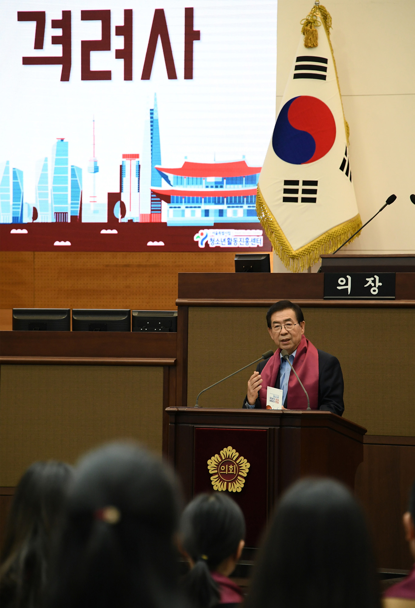 박원순 서울시장이 20일 서울 중구 서울시의회에서 '청소년! 오늘의 상상, 내일의 변화'라는 주제로 열린 제3대 서울시 청소년의회 본회의에 참석해 격려사를 하고 있다. 서울시 제공