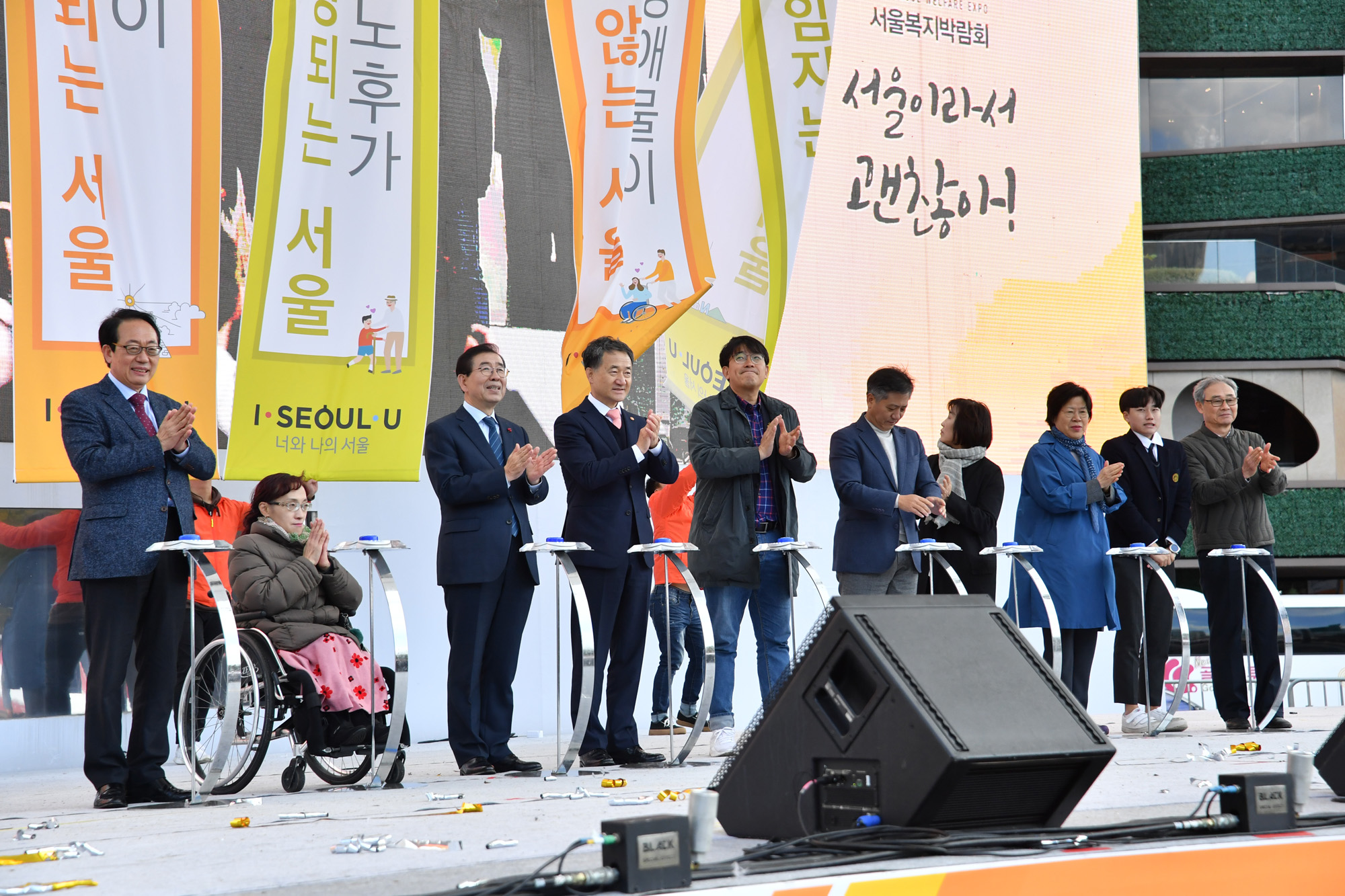 박능후 보건복지부 장관, 박원순 서울시장, 신원철 서울시의회 의장이 27일 오후 서울 중구 서울광장에서 열린 '2018 서울 복지 박람회'에 참석하고 있다. 서울시 제공
