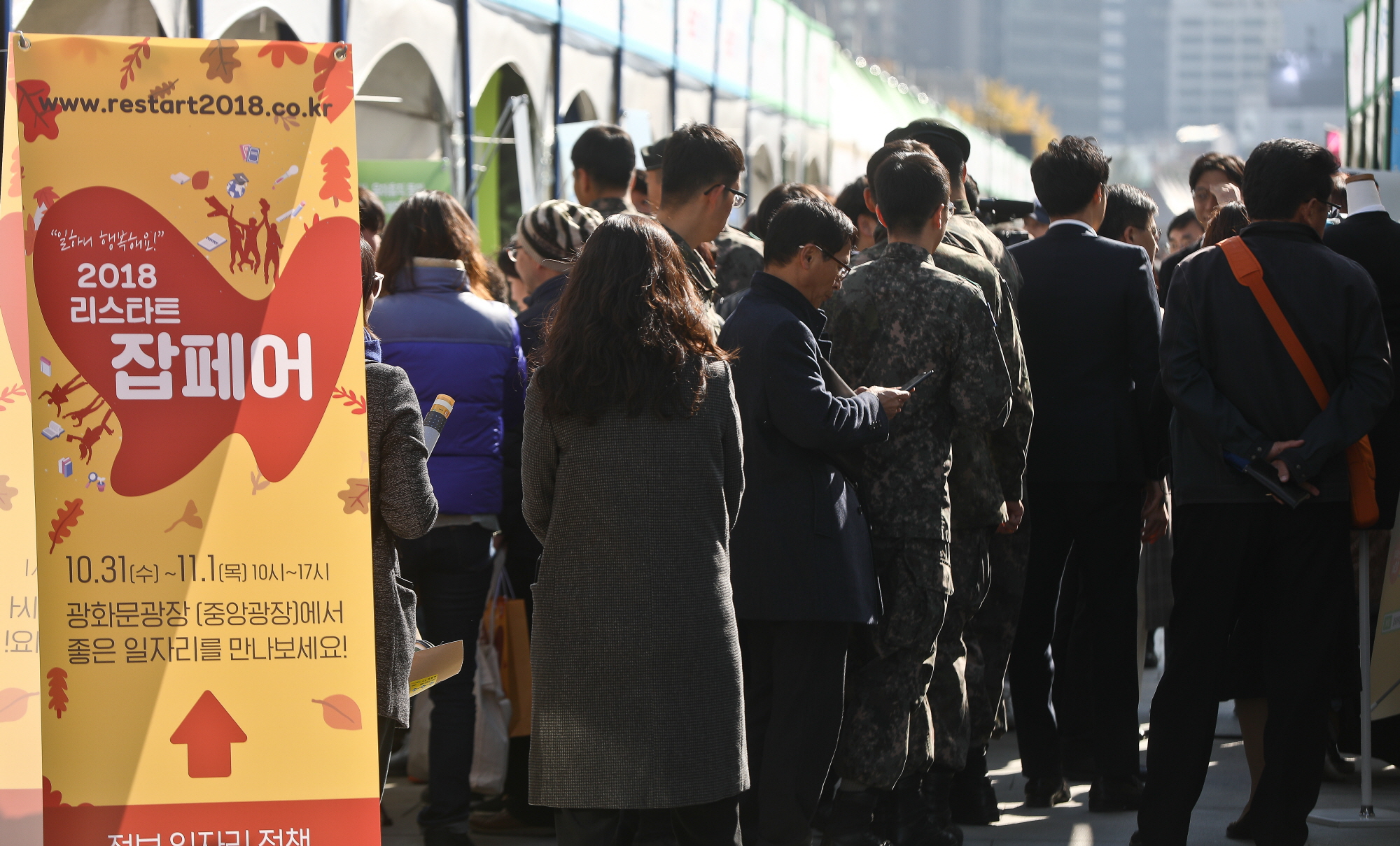 [서울=eoimage] 고성준 기자 = 31일 오후 서울 광화문광장에서 열린 2018리스타트 잡페어를 찾은 시민들이 이력서 작성 및 채용 정보를 확인하고 있다. 2018.10.31