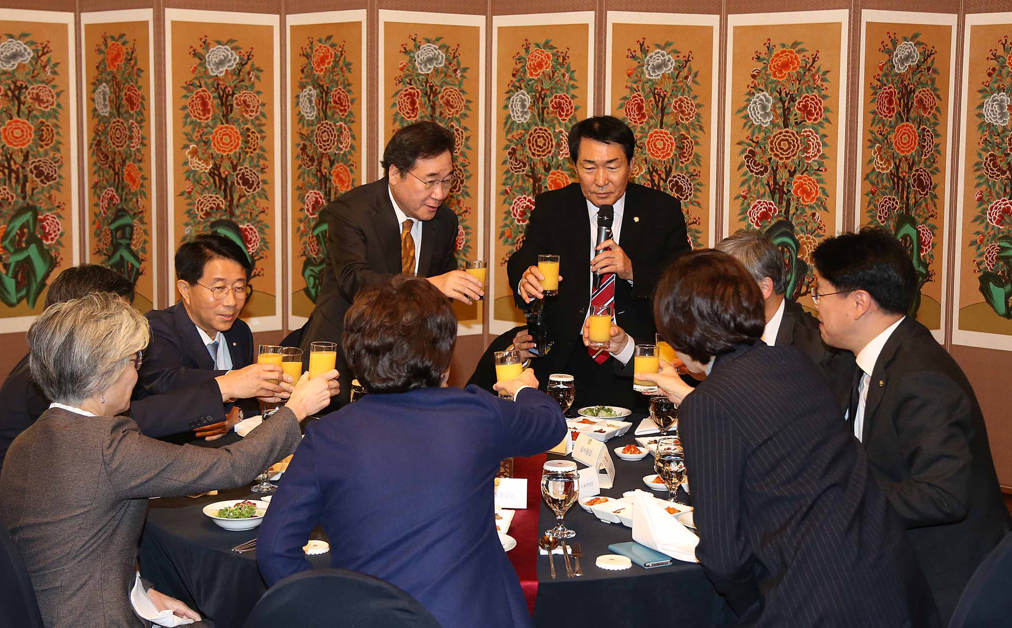 | 사진설명 | 6일 오후 국회 사랑재에서 열린 안상수 국회 예산결산특별위원회 위원장 주최로 열린 오찬 감담회가 열렸다. 안위원장이 건배사 제의하고 있다. 이낙연 총리와 최재형 감사원장, 유은혜 교육부장관, 김동연 기재부장관, 강경화 외교부장관, 김현미 국토부장관과 조성식 장제원 간사가 테이블에 합석했다. |