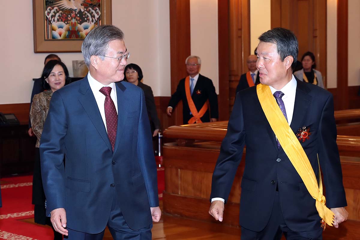 문재인 대통령이 7일 오전 청와대에서 퇴임한 이진성 전 헌법재판소장과 헌법재판관들에게 훈장을 수여한 뒤 함께 환담장으로 향하고 있다.