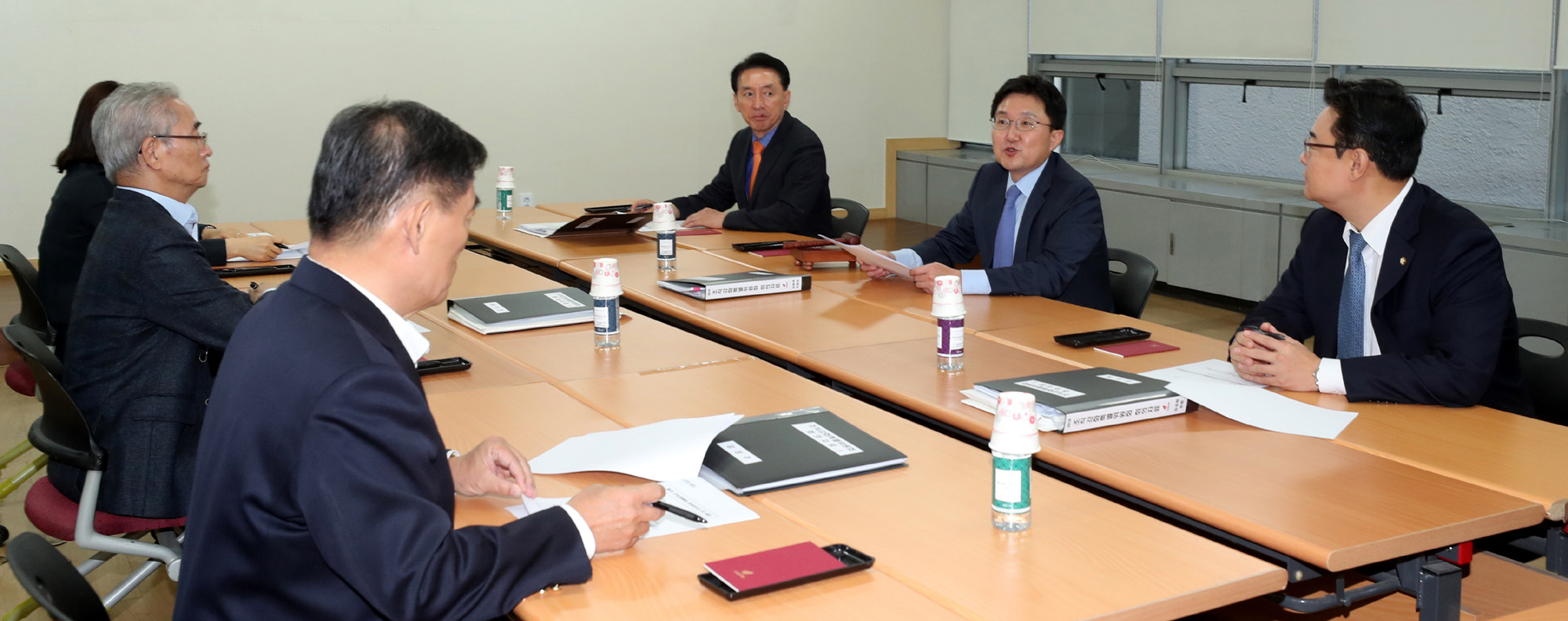김병준 자유한국당 비상대책위원장과 충돌한 전원책 조직강화특별위원회(조강특위) 위원들이 9일 오후 여의도 기계회관에서 조강특위 위원장인 김용태 사무총장의 주도하에 회의를 하고 있다.