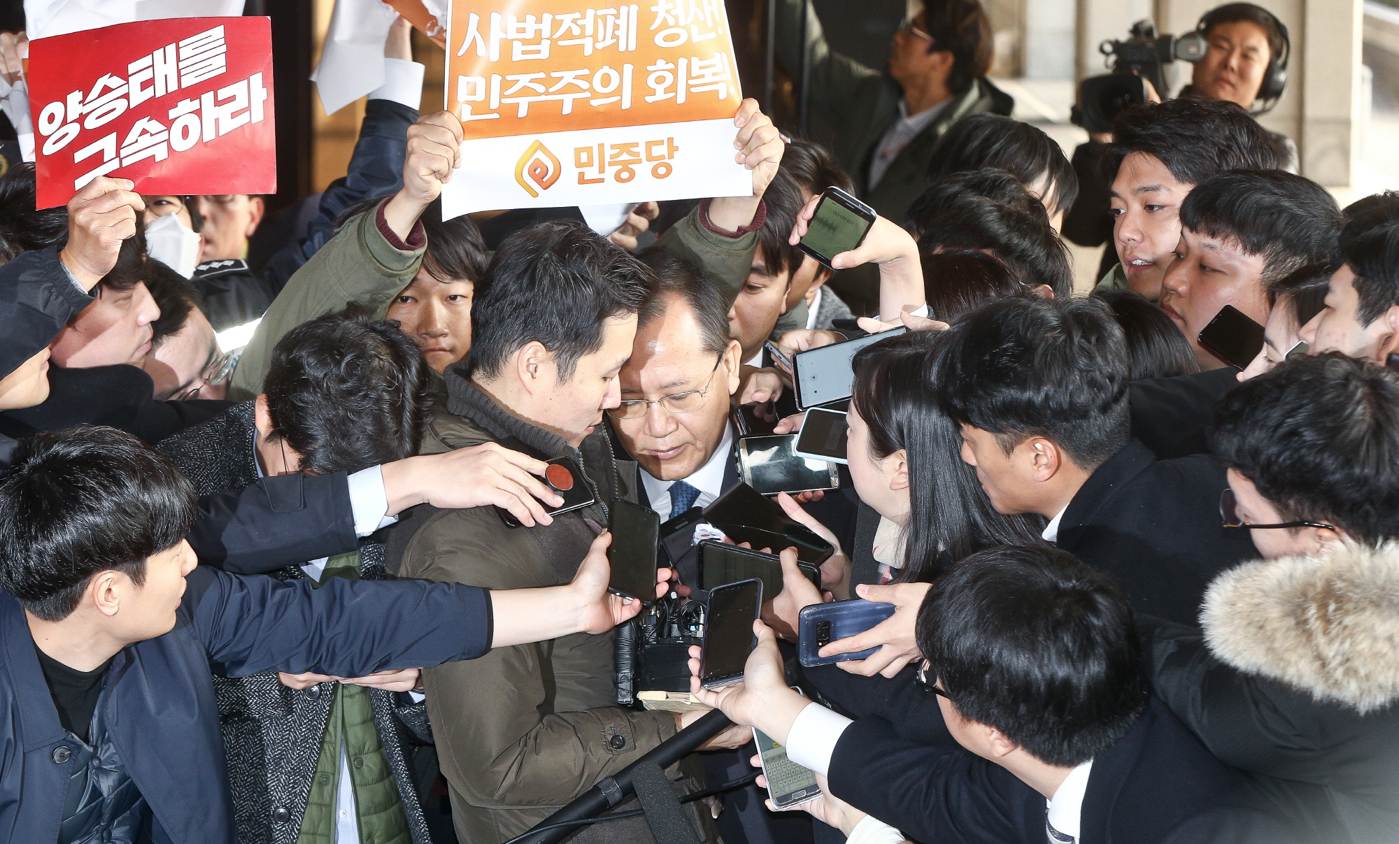 [서울=eoimage] 고성준 기자 = 양승태 전 대법원장 시절 사법행정권을 남용한 혐의를 받는 박병대 전 대법관이 19일 오전 서울 서초구 서울중앙지검에 피의자 신분으로 출석하고 있다. 2018.11.19