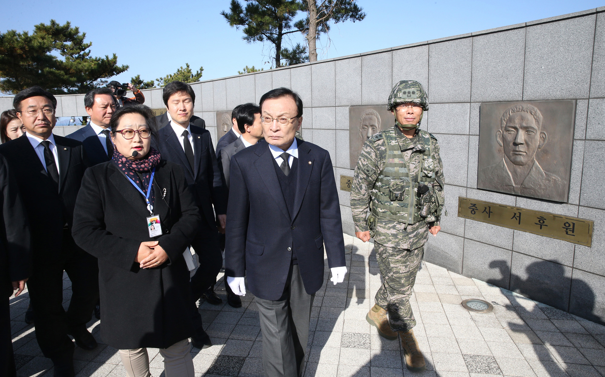 이해찬 더불어민주당 대표가 20일 연평도 내 연평해전 추모비와 평화공원 등을 둘러보고 있다. (조선일보/남강호 기자)