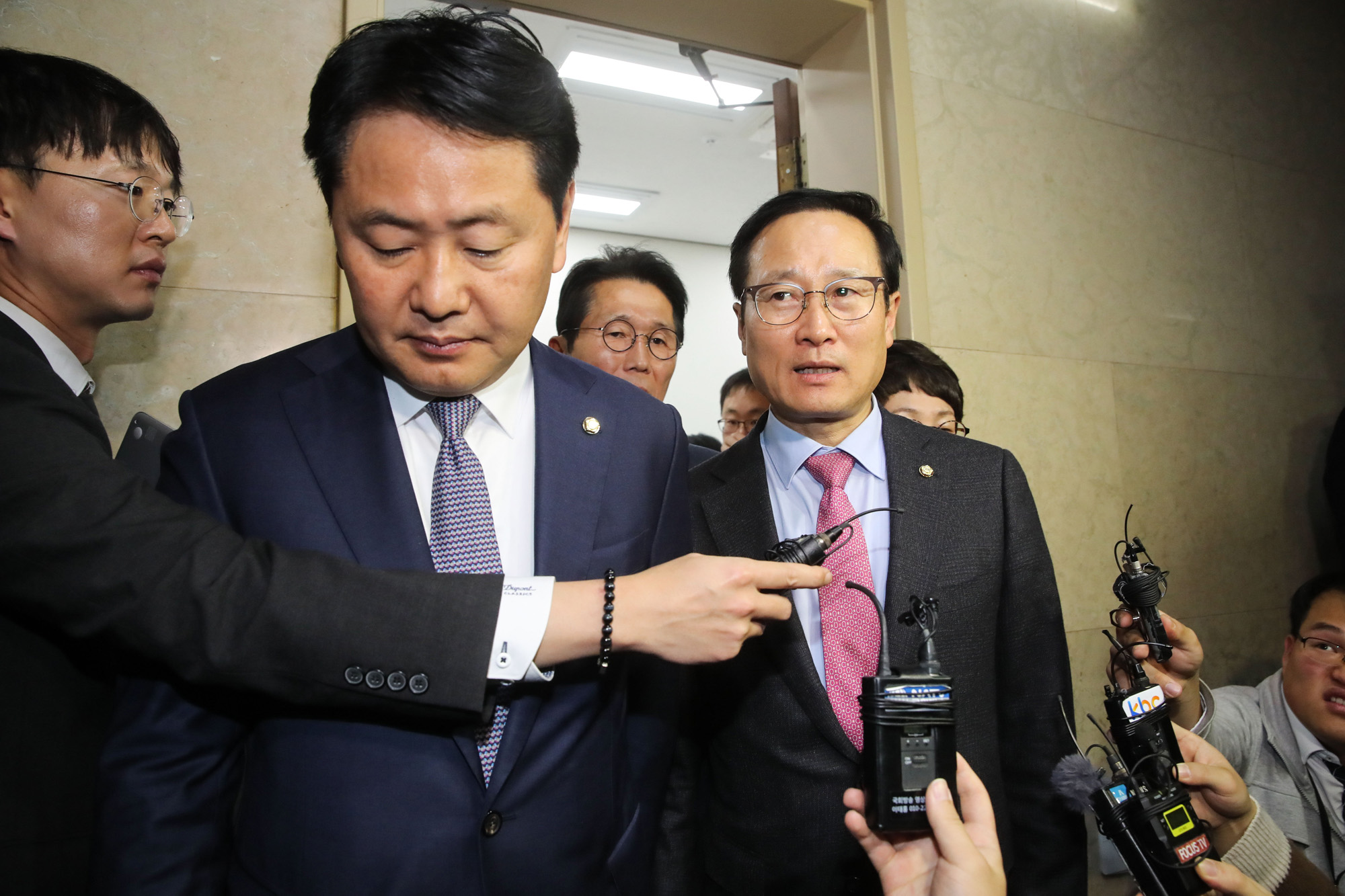 21일 오후 서울 여의도 국회에서 열린 국회의장 소집 5당 원내대표 회동을 마친 뒤 바른미래당 김관영, 더불어민주당 홍영표, 정의당 윤소하 원내대표가 굳은 표정으로 의장실을 나서고 있다. 자유한국당 김성태 원내대표는 가장 먼저 회의장을 나섰다.