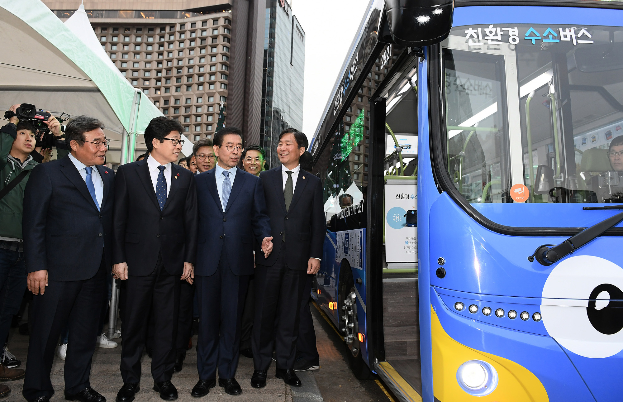 박원순 서울시장, 성윤모 산업통상자원부 장관, 조명래 환경부 장관 등 내빈들이 21일 오후 서울 중구 플라자호텔에서 열린 수소버스 보급·확산을 위한 업무협약식 후 수소버스 시승을 하고 있다. 서울시 제공