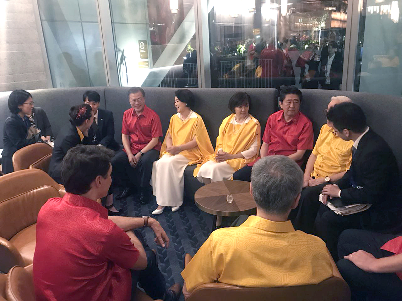 | 사진설명 | 청와대가 20일 문재인 대통령과 부인 김정숙 여사의 싱가포르와 파푸아뉴기니 순방 B컷을 공개했다. APEC 갈라 만찬 전 전통의상으로 갈아입고 대기하는 문재인 대통령, 김정숙 여사와 각국 정상 부부 모습. 김정숙 여사 옆으로 아베 총리 부부, 카메라를 등지고 있는 붉은 의상의 트뤼도 총리, 리센룽 총리가 앉아있다. 사진 청와대제공 |