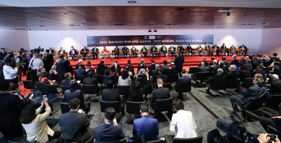 아시아태평양경제협력체(APEC) 정상회의 참석차 파푸아뉴기니를 방문 중인 문재인 대통령과 각국 정상들이 17일 오후(현지시간) 포트모르즈비 APEC 하우스에서 열린 'APEC 지역 기업인 자문위원회(ABAC)와의 대화'에 참석해 기업인들의 발언을 듣고 있다