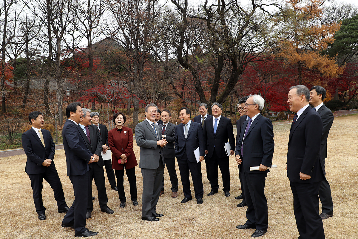 문재인 대통령이 21일 청와대 본관 집현실에서 열린 '국정과제위원회 및 대통령자문위원회 오찬간담회'를 마친 후 참석자들과 경내를 산책하고 있다.