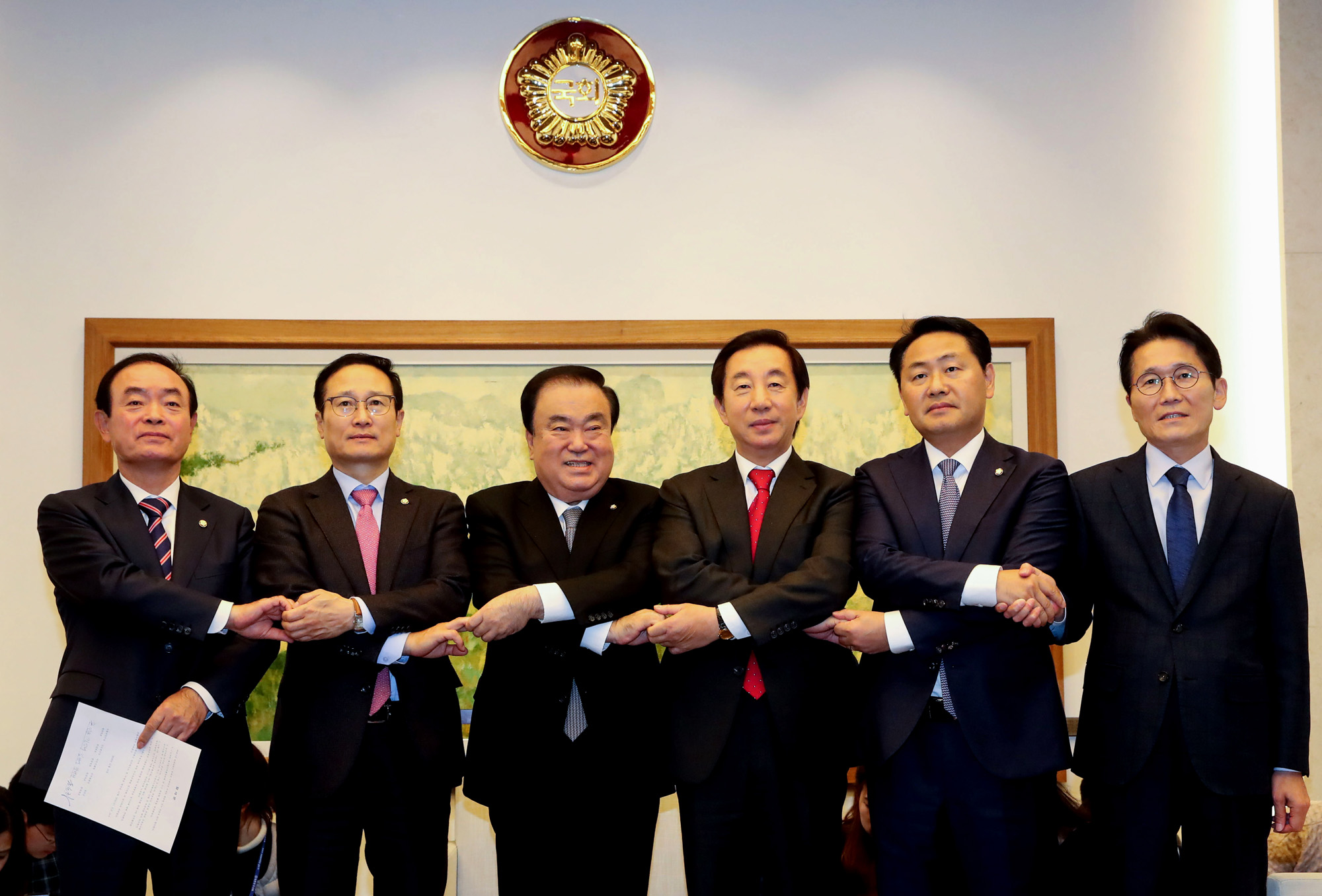 국회정상화에 합의한 문희상 국회 의장과 여야 원내대표들이 21일 국회의장실에서 합의문 발표에 앞서 사진촬영을 하고 있다. 왼쪽부터 민주평화당 장병완, 더불어민주당 홍영표 원내대표, 문 의장, 자유한국당 김성태, 바른미래당 김관영, 정의당 윤소하 원내대표