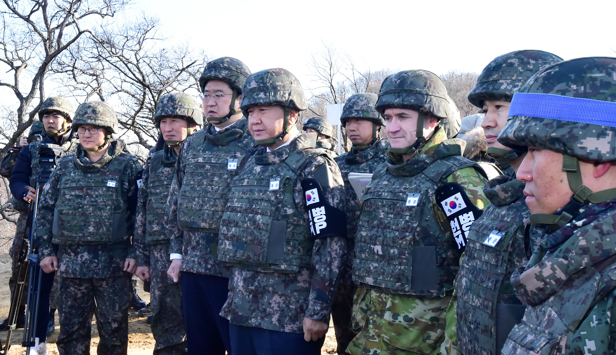 남북은 9.19 군사합의 등에 따라 내년 4월 본격 공동유해 발굴에 앞서 강원도 철원 부근 비무장지대(DMZ) 내 화살머리고지에 전술도로 개설 작업을 진행하는 가운데 22일 서주석 국방부 차관과 군 지휘관들이 도로 개설 현황 브리핑을 경청하고 있다. 남북의 전술도로은 지난 1953년 정전협정 체결 이후 65년만으로 도로 연결 작업은 DMZ 내에서 이뤄지는 만큼 육군 공병대가 투입, 지난 1일부터 일대 지뢰제거 작업 및 도로개설을 시작했다. 한편 화살머리고지는 6·25전쟁 당시 남북이 치열하게 전투를 했던 철의 삼각지 전투 지역 중 하나로 종전을 앞두고 1953년 6월29일과 7월11일 두 차례에 걸쳐 중공군을 상대로 연합군이 격전을 벌여 승리한 지역으로 알려졌으며 국방부는 이 일대에 국군 전사자 200여명, 미군 및 프랑스 전사자 100여명 등과 함께 북한군, 중공군 유해도 매장됐을 것으로 추정하고 있다. 2018.11.22. 사진공동취재단 |