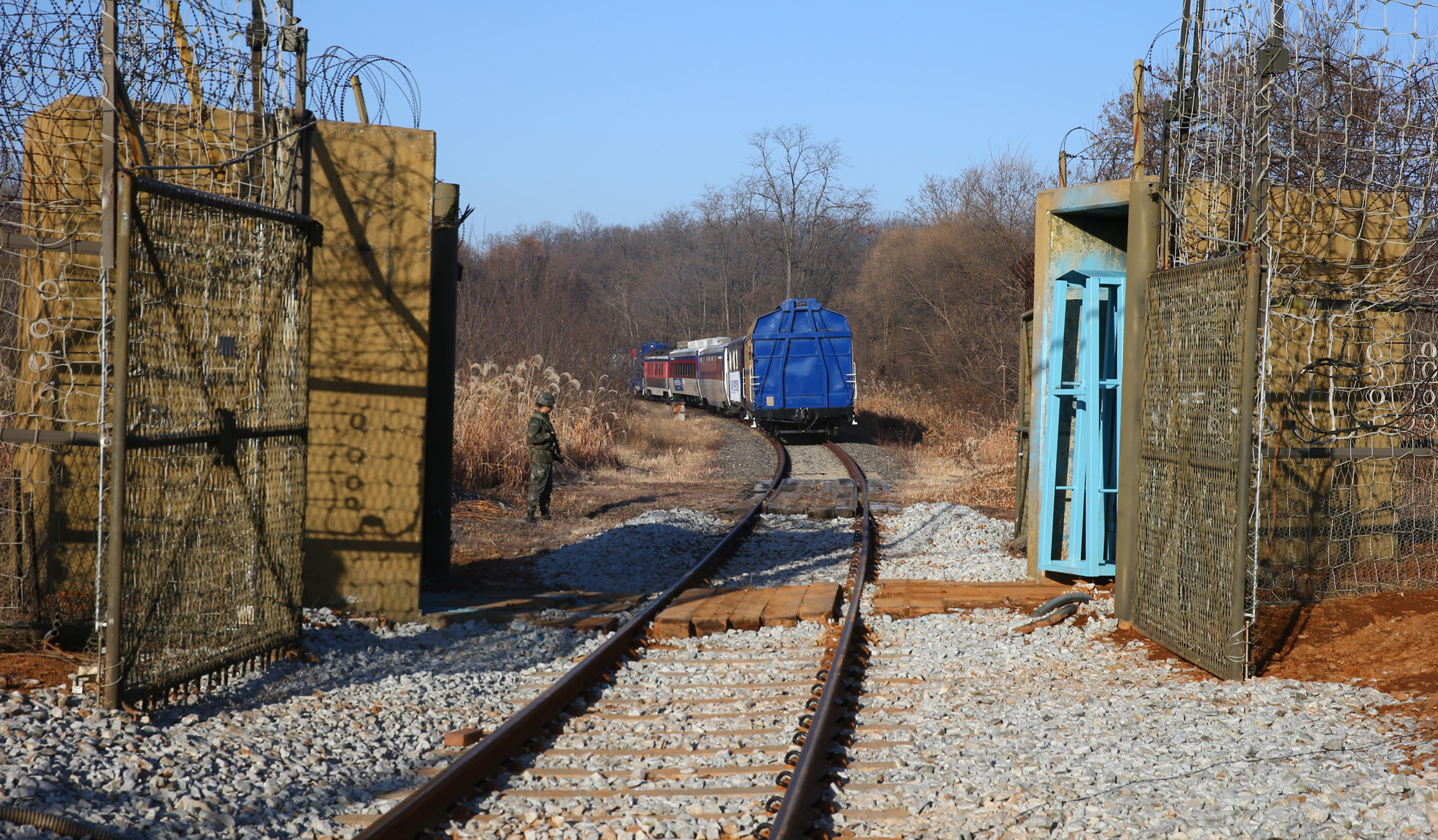 30일 오전 경기도 파주시 장단면 비무장지대내 경의선철도통문안으로 남북공동철도조사단을 태운 열차가 들어가고 있다. 18.11.30. 사진공동취재단