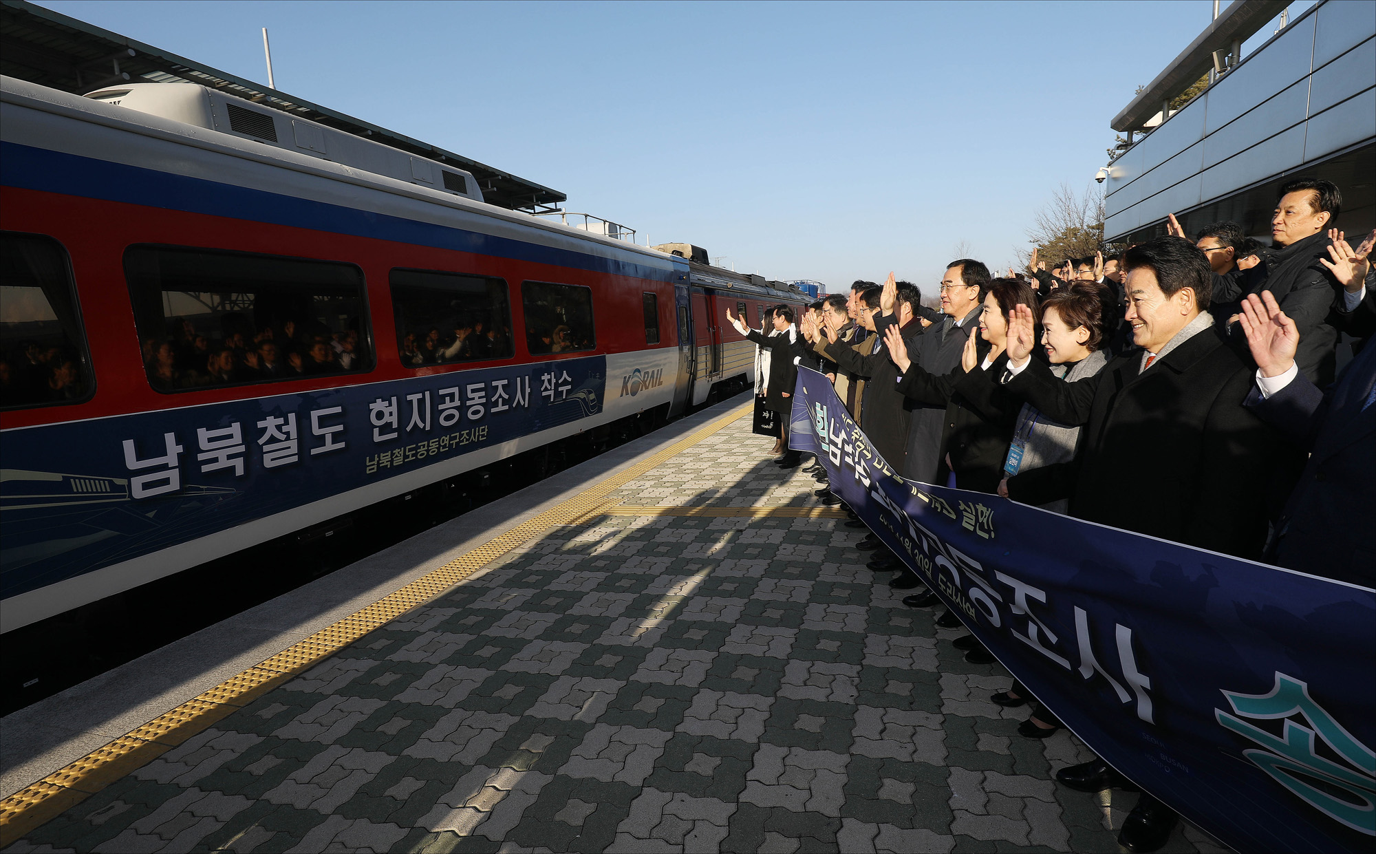 조명균 통일부 장관, 김현미 국토교통부 장관, 박순자 국회 국토교통위원장, 정동영 민주평화당 대표 등이 30일 오전 경기도 파주시 도라산역에서 남북 철도 공동 현지조사를 위해 신의주로 떠나는 조사단이 탑승한 열차를 향해 손을 흔들고 있다. 18.11.30. 사진공동취재단