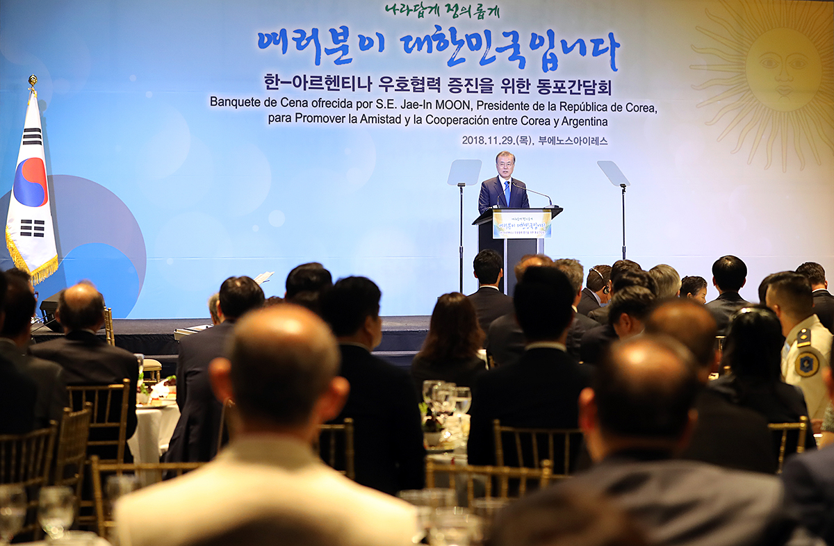 문재인 대통령이 29일 오후(현지시간) 아르헨티나 부에노스아이레스 시내 알베라르 아이콘 호텔에서 열린 동포간담회에서 인사말을 하고 있다.