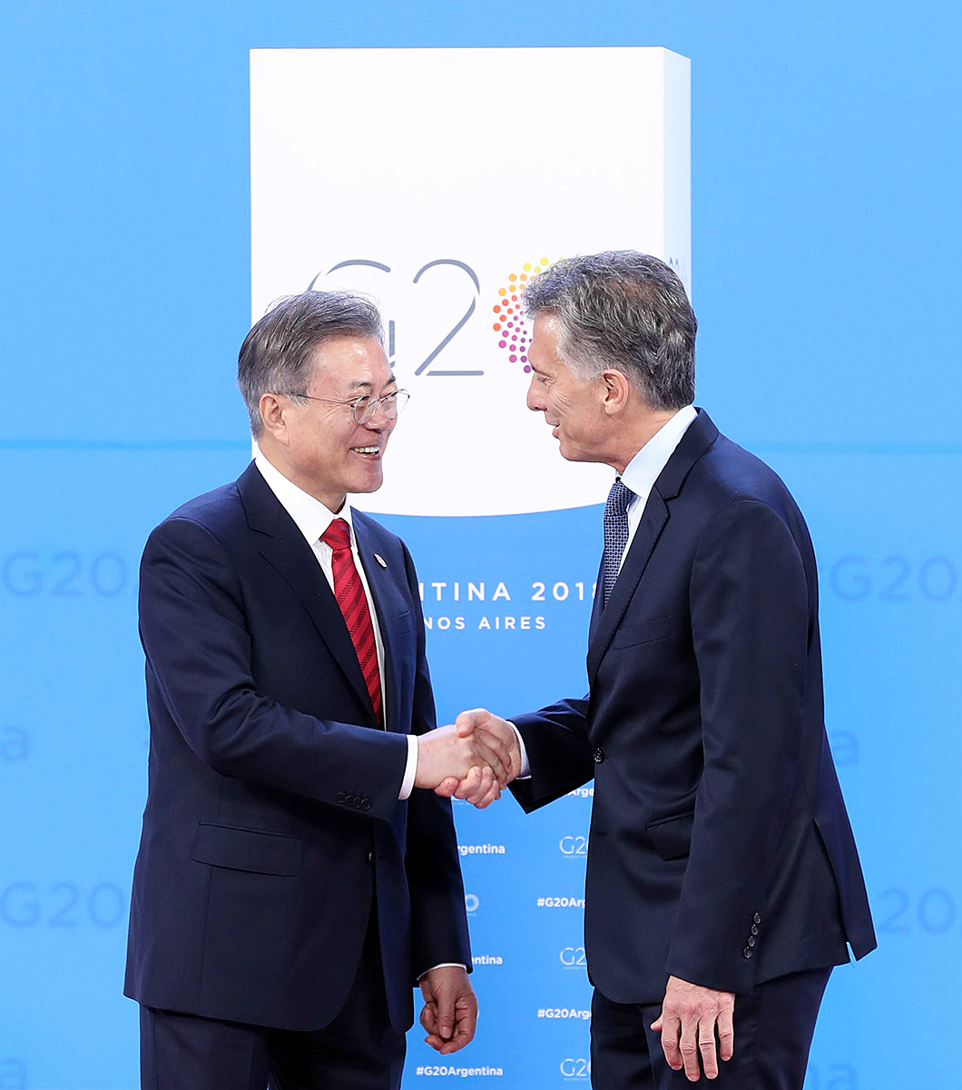 문재인 대통령과 마우리시오 마크리?아르헨티나 대통령이 30일 오전(현지시간) 아르헨티나 부에노스아이레스 코스타 살게로 센터 내 G20 리트리트 회의장 앞에서 기념촬영을 하고 있다. 2018.11.30 사진 청와대제공