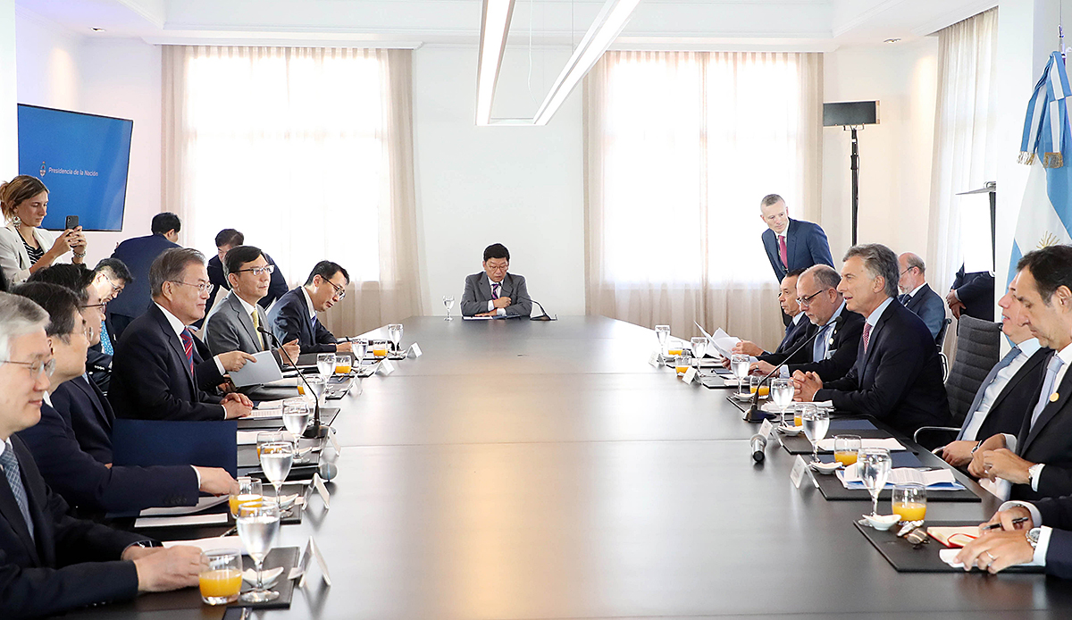 문재인 대통령과 마우리시오 마크리 아르헨티나 대통령이 1일 오전(현지시간) 아르헨티나 부에노스 아이레스 대통령관저에서 조찬을 겸한 정상회담을 갖고 있다.2018.12.01 사진 청와대제공