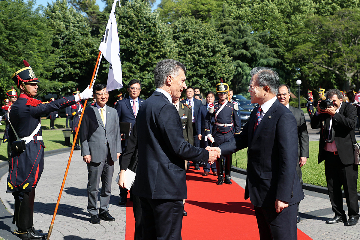문재인 대통령이 1일 오전(현지시간) 아르헨티나 부에노스 아이레스 대통령관저에서 마우리시오 마크리 아르헨티나 대통령과 악수하고 있다.2018.12.01 사진 청와대제공