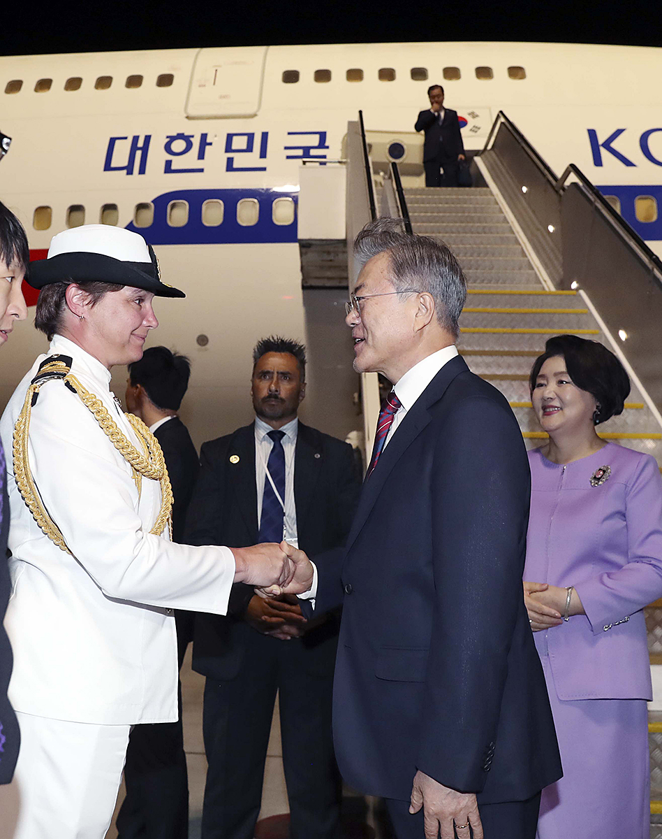 뉴질랜드를 국빈 방문한 문재인 대통령이 2일(현지시각) 오후 뉴질랜드 오클랜드 국제공항에 도착해 엠마 그랜트 해군 중령(총독 대리)과 악수하고 있다. 2018.12.02. 사진 청와대제공