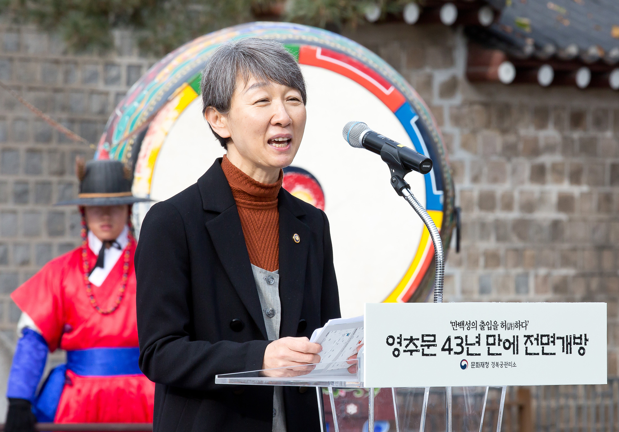[서울=eoimage] 임준선 기자 =6일 오전 서울 종로구 경복궁에서 ‘영추문 43년 만에 전면개방’ 기념 행사가 열리고 있다. 영추문 개방으로 경복궁을 동서남북 모든 방향에서 출입할 수 있게 되었다. 사진은 정재숙 문화재청장이 기념사를 하고 있다. 2018.12.06
