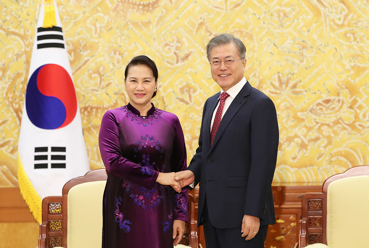 문재인 대통령은 6일 오후 5시30분 본관 접견실에서 공식 방한 중인 응웬 티 킴 응언(Nguyen Thi Kim Ngan) 베트남 국회의장을 접견하고 있다.