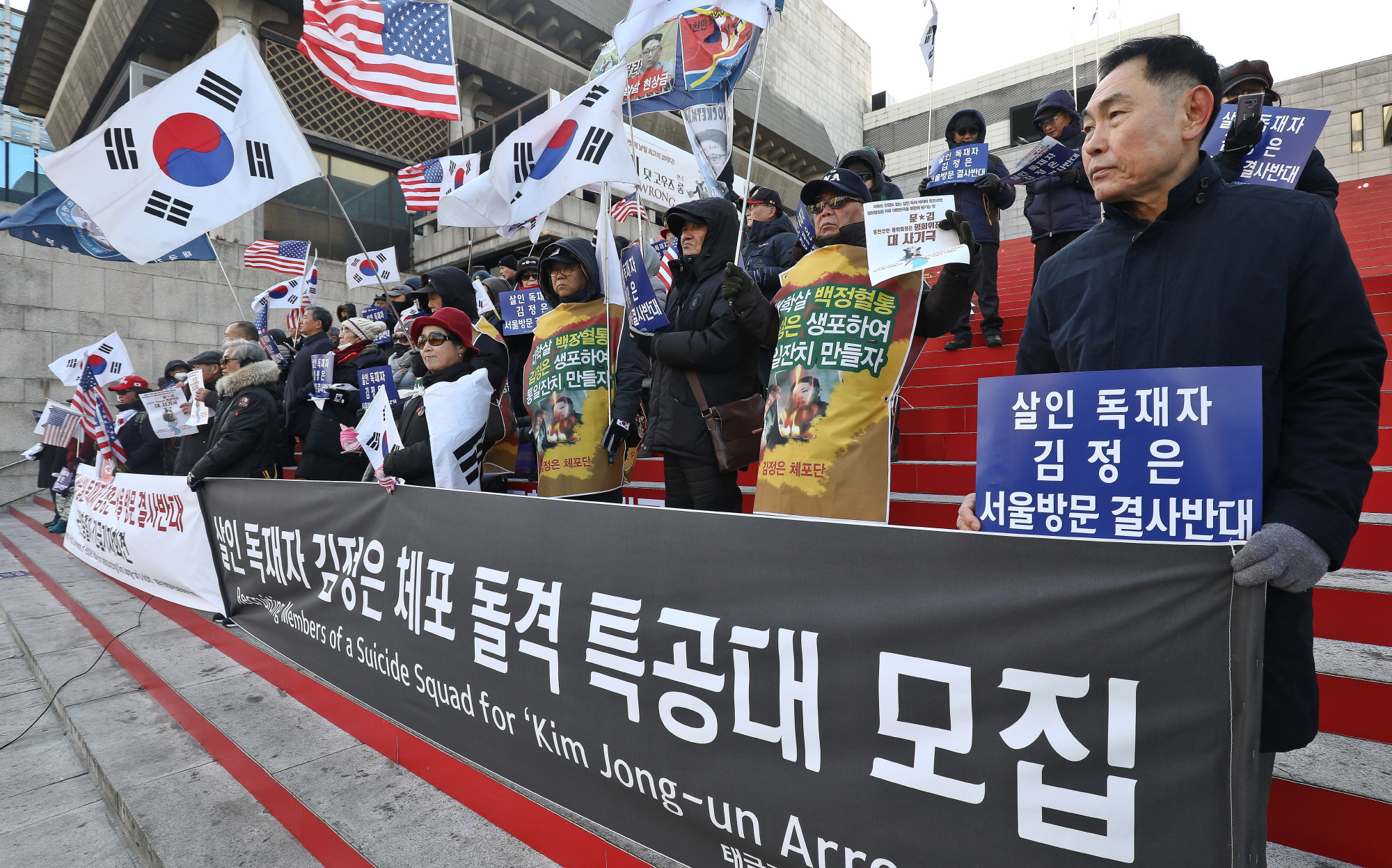 [서울=eoimage] 고성준 기자 = 태극기혁명국민운동본부 회원들이 7일 오후 서울 종로구 세종문화예술회관 계단에서 김정은 방남 반대 기자회견을 열고 있다. 2018.12.7
