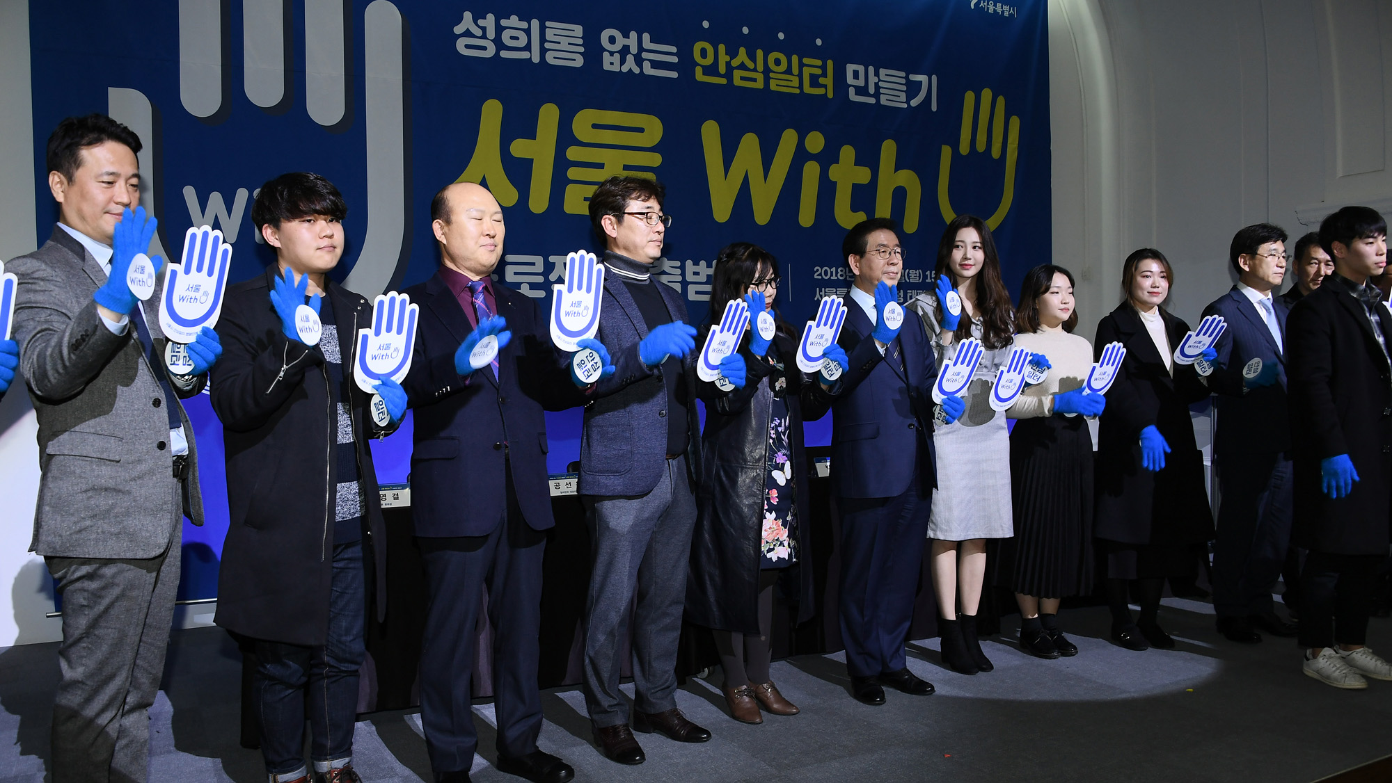 박원순 서울시장이 3일 오후 서울 중구 시민청에서 열린 성희롱 근절을 위한 '서울 위드유(#WithU)'출범식에서 안심일터 캠페인 홍보대사로 위촉된 걸스데이 유라와 홍보 피켓을 들고 기념촬영하고 있다. 서울시 제공