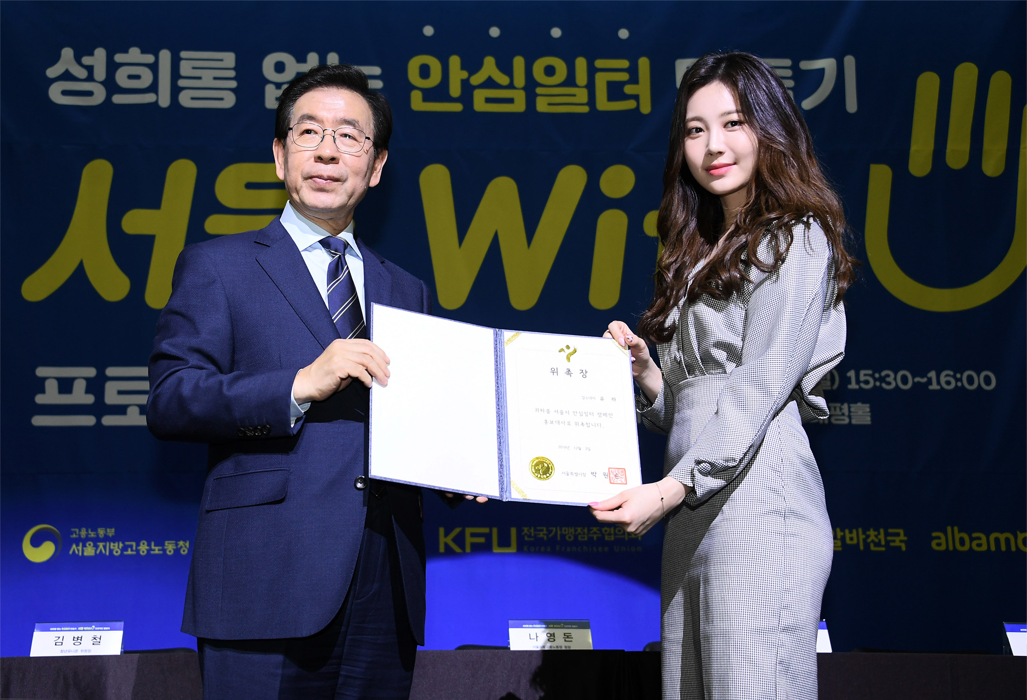 박원순 서울시장이 3일 오후 서울 중구 시민청에서 열린 성희롱 근절을 위한 '서울 위드유(#WithU)'출범식에서 안심일터 캠페인 홍보대사로 위촉된 걸스데이 유라와 홍보 피켓을 들고 기념촬영하고 있다. 서울시 제공