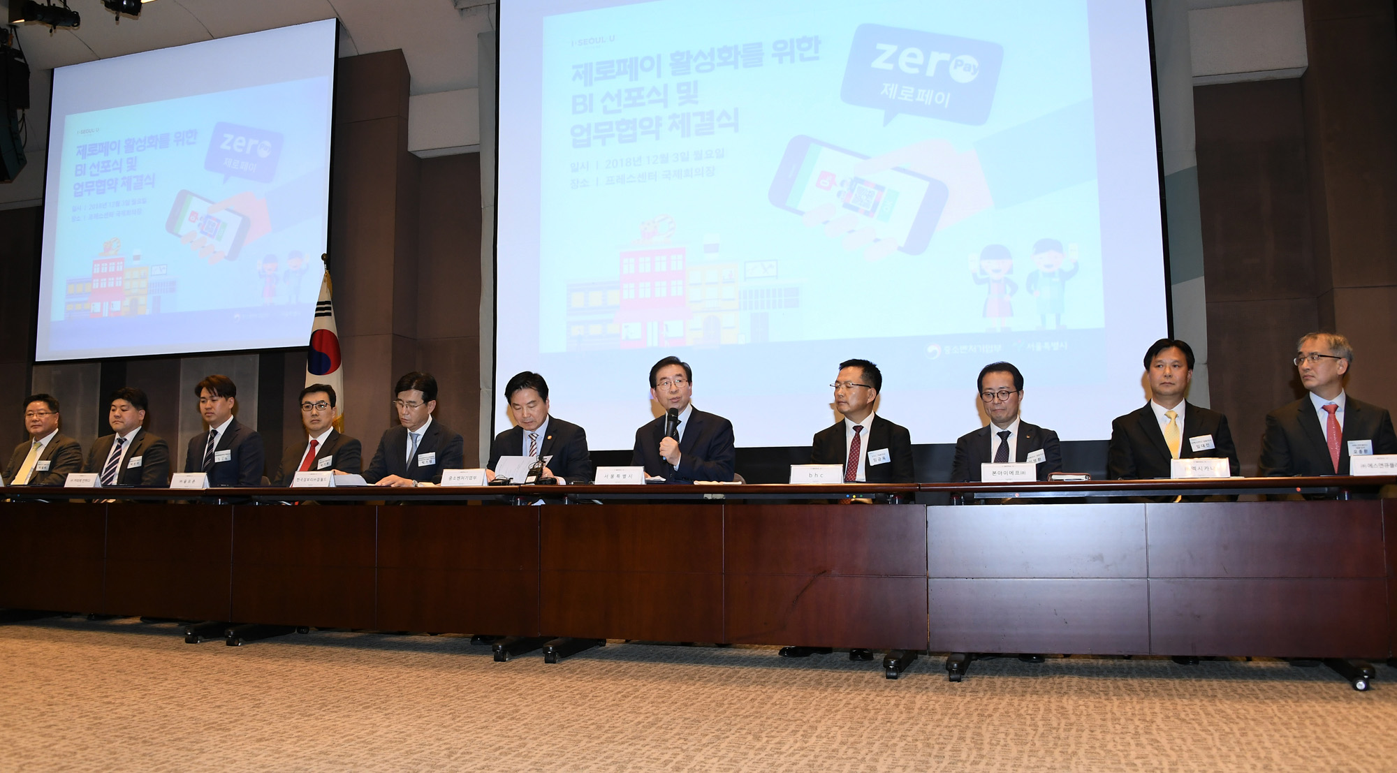 박원순 서울시장(오른쪽)과 홍종학 중소벤처기업부 장관이 3일 오후 서울 중구 한국프레스센터에서 열린 제로페이 활성화를 위한 BI 선포식 및 업무협약 체결식에 참석하고 있다. 서울시 제공