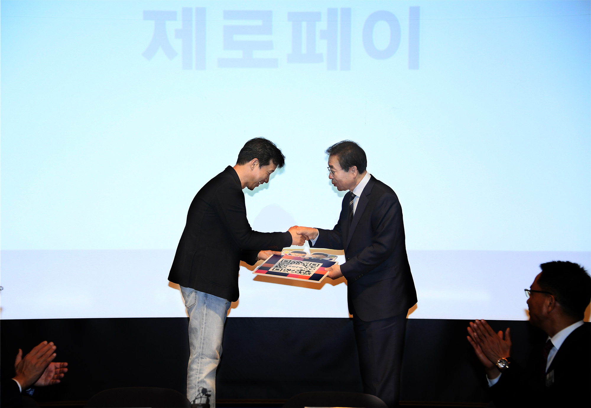 박원순 서울시장(오른쪽)과 홍종학 중소벤처기업부 장관이 3일 오후 서울 중구 한국프레스센터에서 열린 제로페이 활성화를 위한 BI 선포식 및 업무협약 체결식에 참석하고 있다. 서울시 제공
