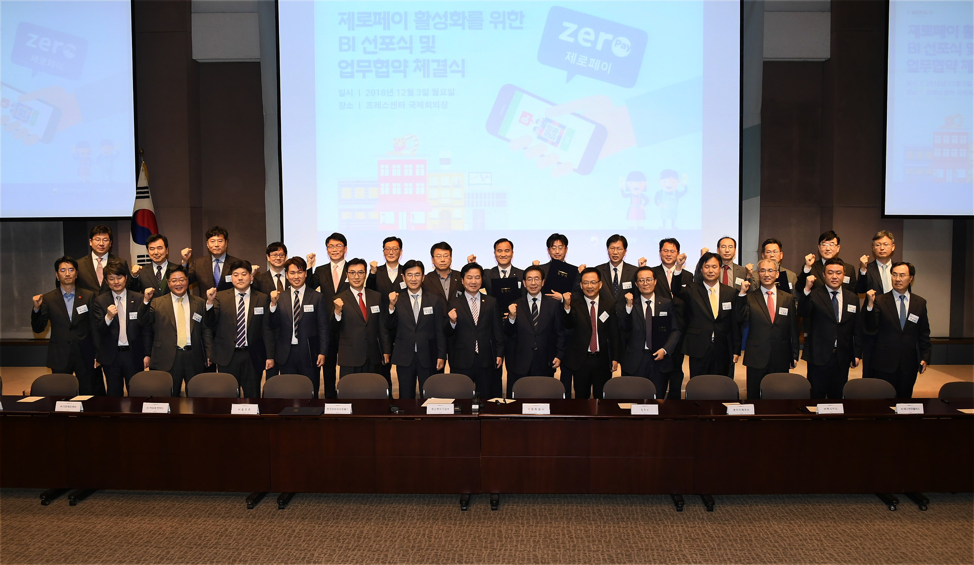 박원순 서울시장(오른쪽)과 홍종학 중소벤처기업부 장관이 3일 오후 서울 중구 한국프레스센터에서 열린 제로페이 활성화를 위한 BI 선포식 및 업무협약 체결식에 참석하고 있다. 서울시 제공