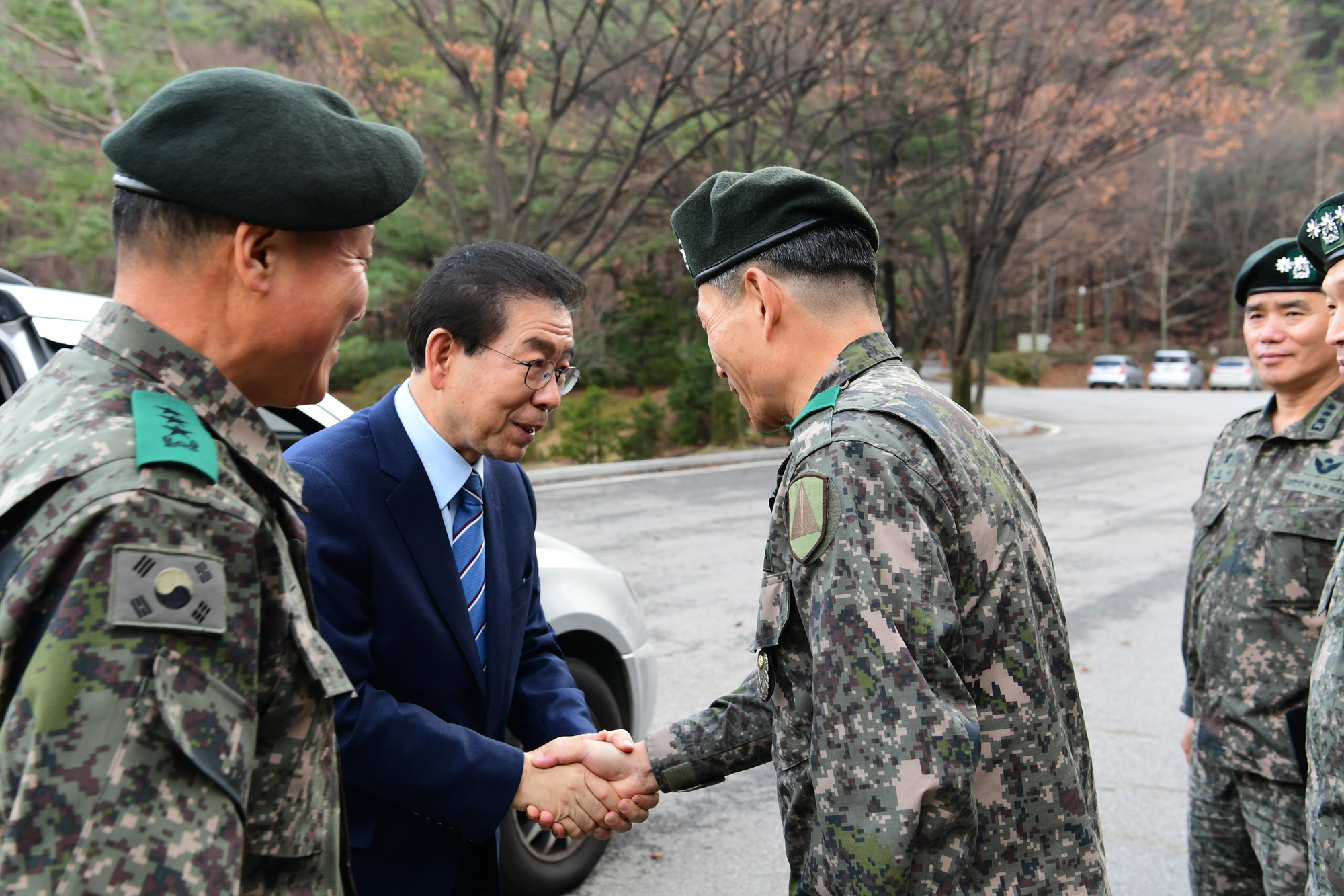 박원순 서울시장이 4일 연말연시를 맞아 서울 수도방위사령부를 방문해 김정수 수도방위사령관에게 위문금을 전달한 뒤 기념촬영을 하고 있다. 서울시 제공