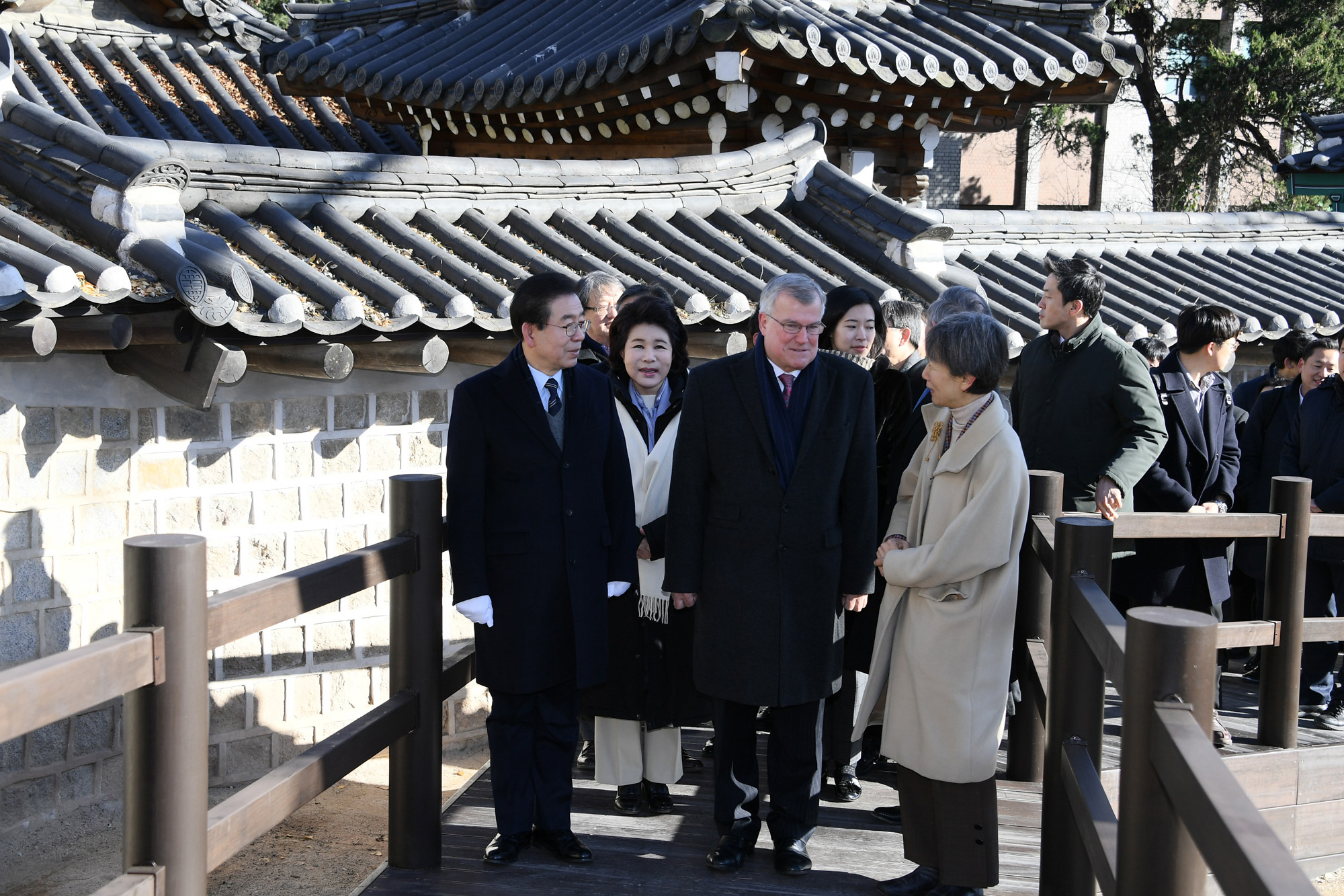 박원순 서울시장, 정재숙 문화재청장, 사이먼 스미스 주한영국대사, 해리 해리스 주한미국대사 등이 7일 서울 중구 영국대사관 앞에서 열린 '덕수궁 돌담길 연결' 기념행사에 참석하고 있다. 서울시 제공