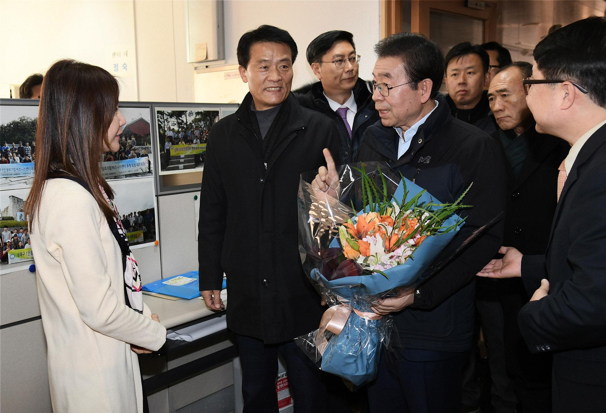 박원순 서울시장이 지난 10일 성북구에 있는 ‘서울 VR/AR 제작지원센터’를 찾아 이승로 성북구청장을 비롯 관계자, 입주기업 기업가들과 이야기를 나누고 있다. 서울시 제공