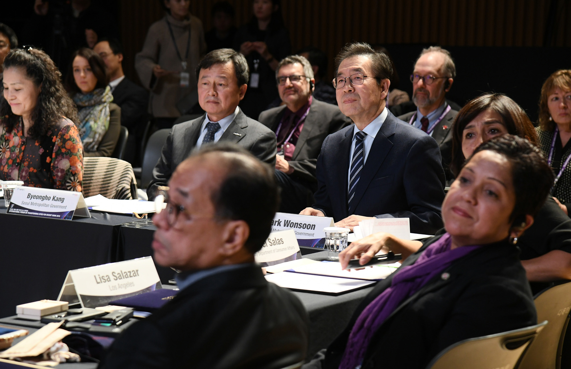 12일 오후 서울시청 다목적홀에서 열린 '서울시 좋은 일자리 도시 국제 포럼 폐회식'에서 박원순 서울시장이 폐회사를 하고 있다. 서울시 제공