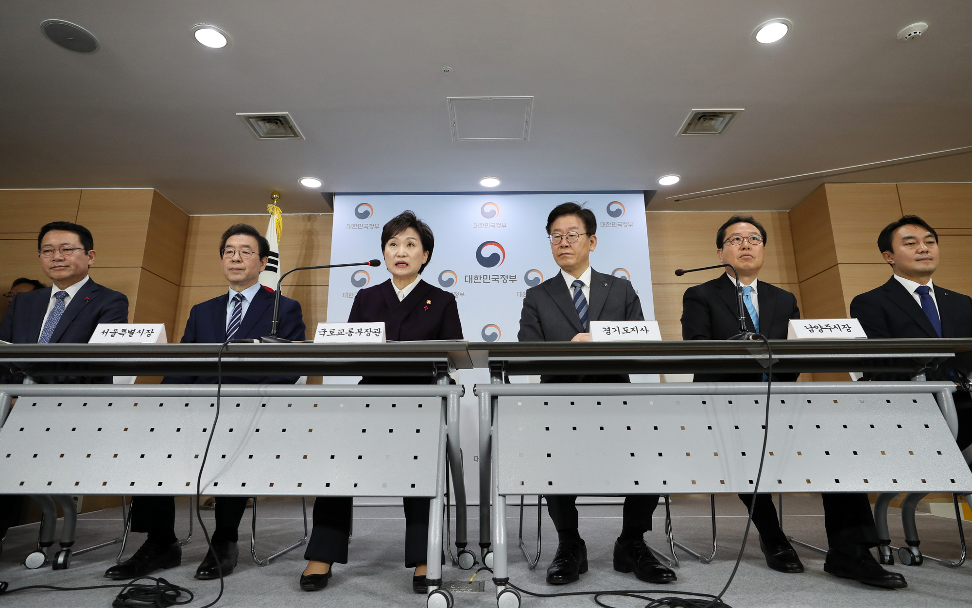 김현미 국토교통부 장관이 19일 서울 종로구 정부서울청사 브리핑룸에서 2차 수도권 주택공급 계획 및 수도권 광역교통망 개선방안을 발표하고 있다. 왼쪽부터 박형우 계양구청장, 박남춘 인천시장, 박원순 서울시장, 김 장관, 이재명 경기도지사, 조광한 남양주시장, 김상호 하남시장, 김종천 과천시장. 2018.12.19 사진/임준선기자(현장풀) |