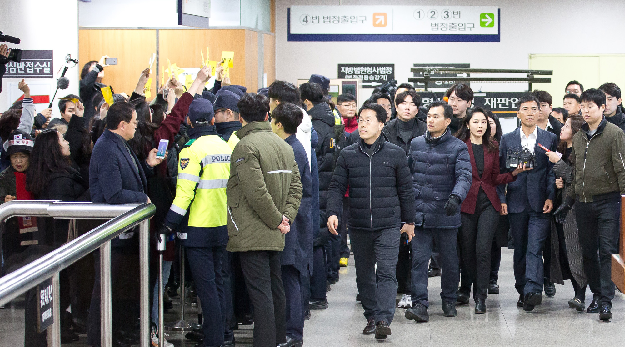 [서울=eoimage] (이오이미지) 임준선기자 =지위를 이용해 비서에게 성폭력을 가한 혐의에 대해 1심에서 무죄를 선고받은 안희정 전 충남도지사가 21일 오전 서초구 서울고법에서 열린 항소심 첫 공판에 출석하고 있다. 2018.12.21